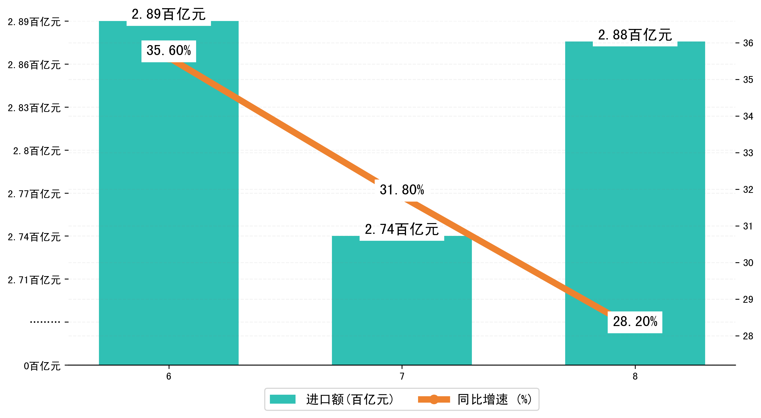 以人民币计,2023年8月广西壮族自治区进口额为287,5773.855万元,相比上月增加了13,6445.1784万元;相比上年同期增加了21,1669.7428万元,同比增加了28.20%。
