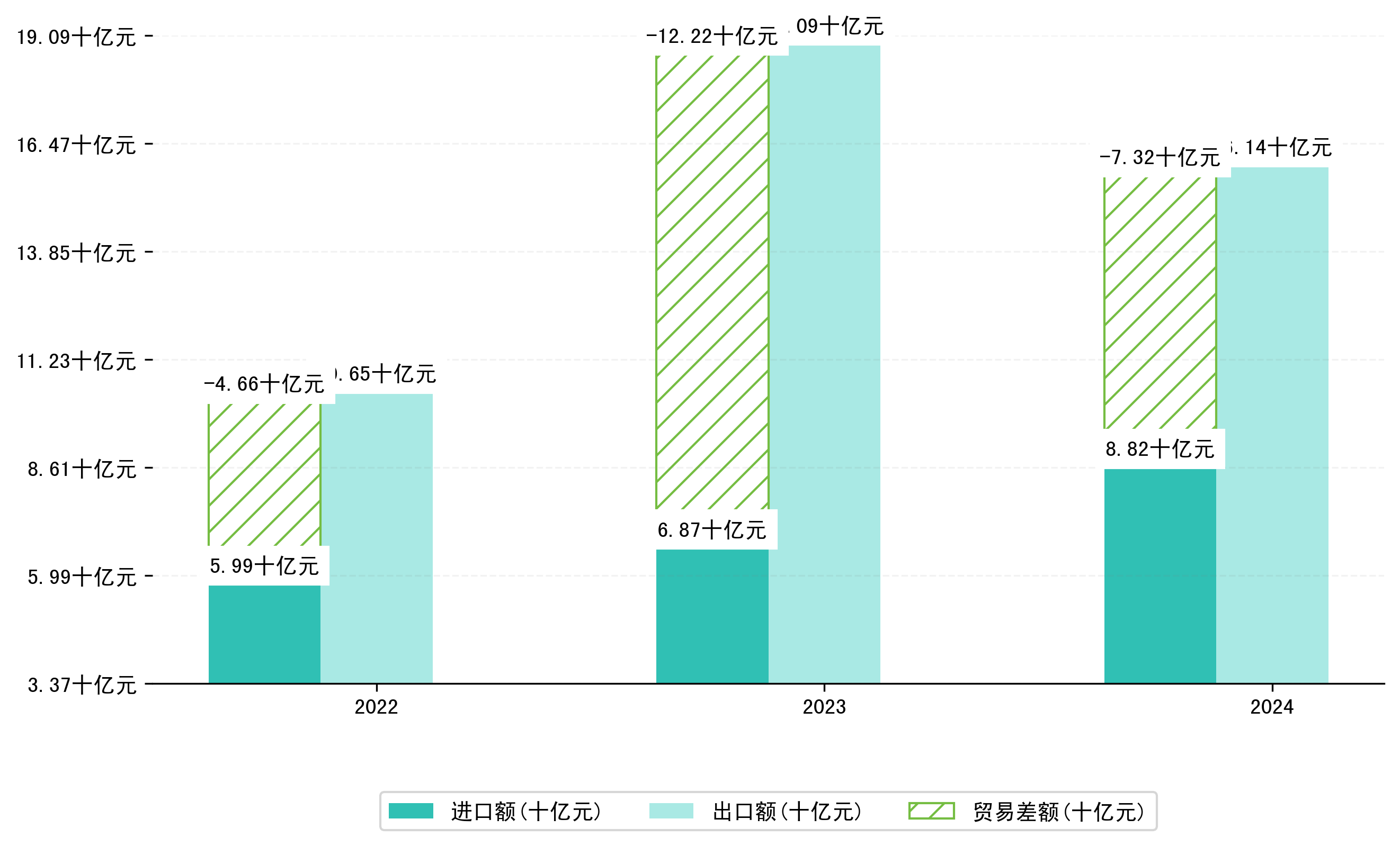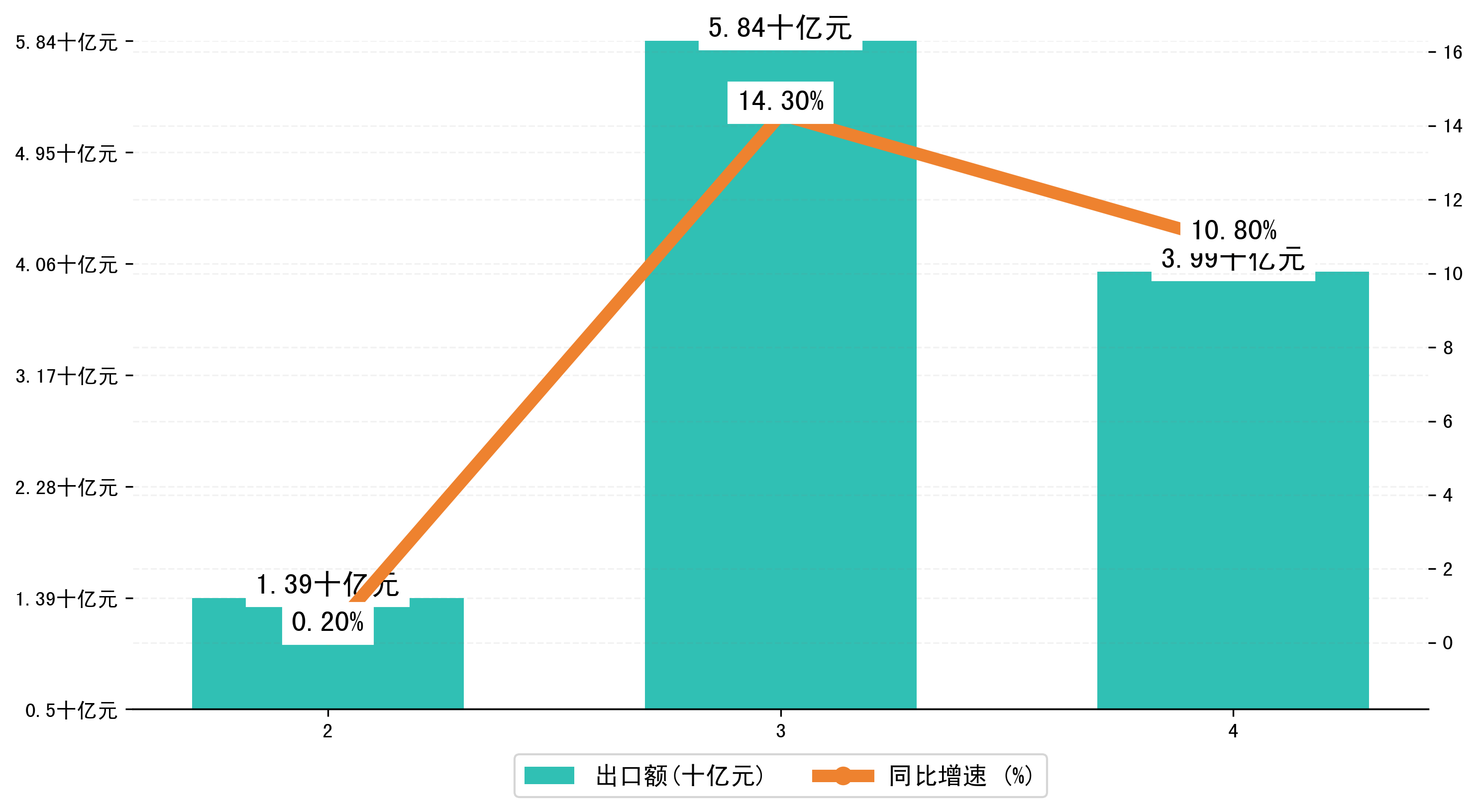 以人民币计,2024年4月贵州省贸易差额为19,4195,3478万元(贸易顺差),相比上月减少了8269,3592万元,即1137,3314万美元;相比上年同期减少了8,7050,1402万元,同比减少-30.95%。