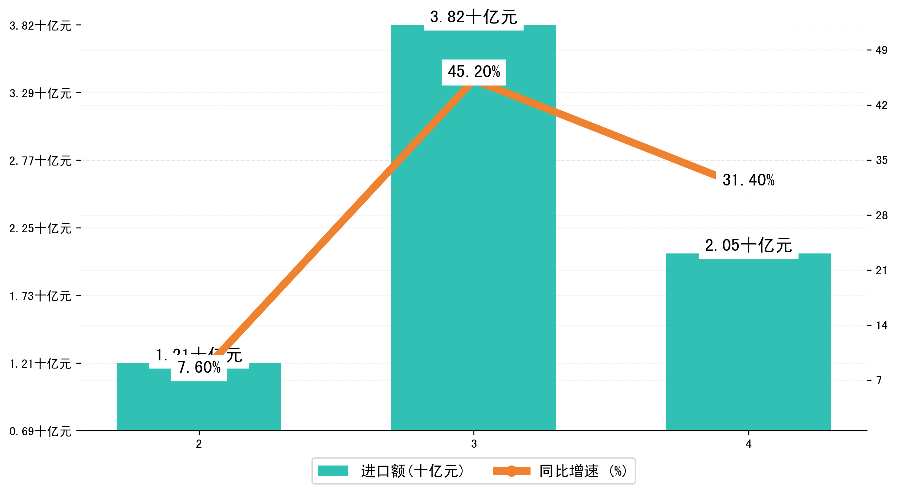 以人民币计,2024年1-4月贵州省进口额为88,2237.8861万元,相比上年同期增加了19,5478.6544万元,同比增加了31.40%。
