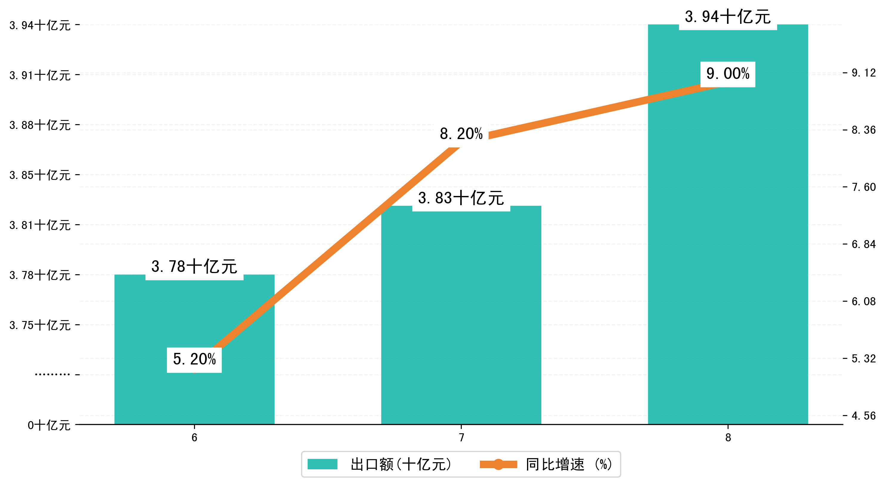 以人民币计,2024年8月贵州省出口额为39,4358.2211万元,相比上月增加了1,1809.042万元;相比上年同期增加了5,0884.3676万元,同比增加了9.00%。