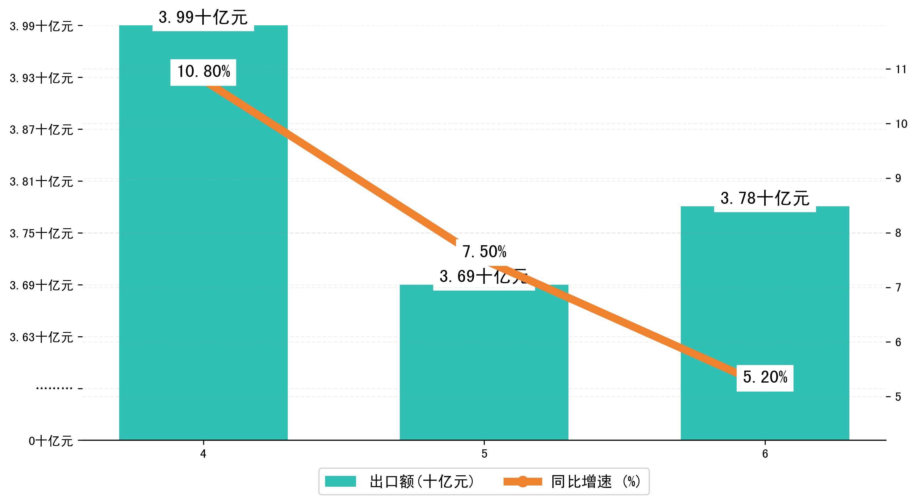 以人民币计,2024年6月贵州省出口额为37,8088.6342万元,相比上月增加了9242.6122万元;相比上年同期减少了3,0037.6007万元,同比增加了5.20%。