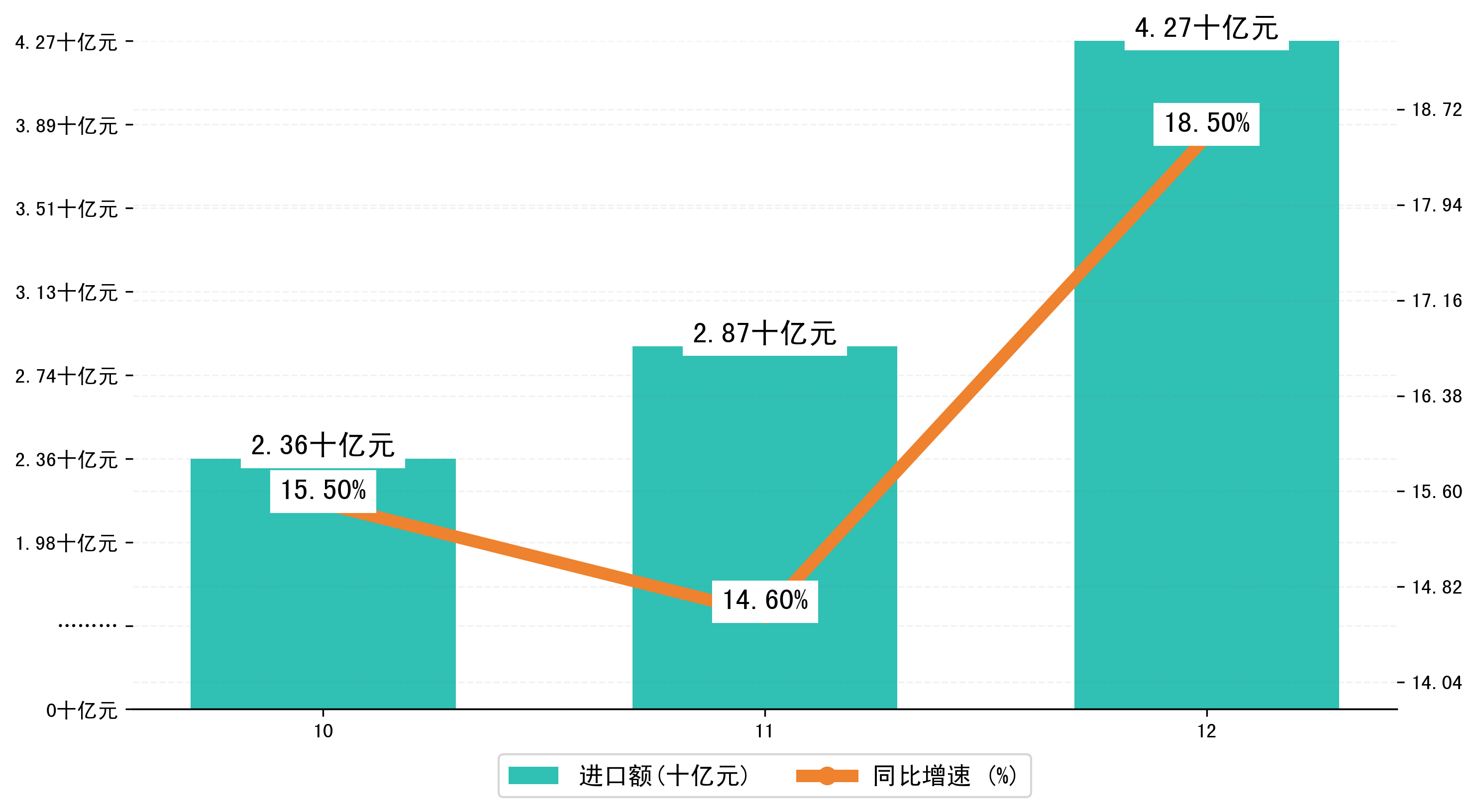 以美元计,2024年1-12月贵州省进口额为39,7689.9849万美元,相比上年同期增加了5,7918.8248万美元,同比增加17.20%。