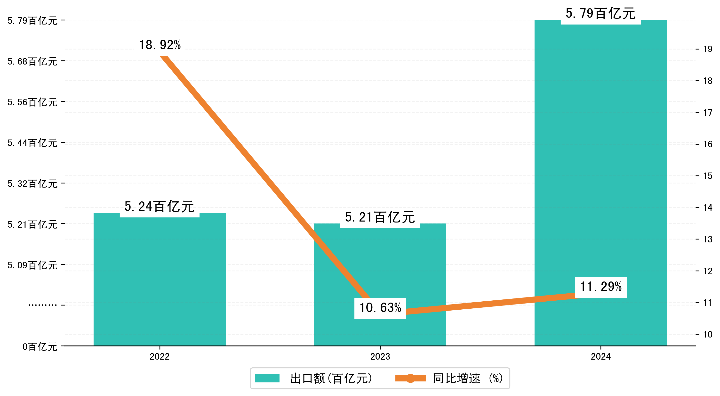 以人民币计,2024年1-12月贵州省出口额为579,2710.6948万元,相比上年同期增加了58,7445.7314万元,同比增加了11.30%。