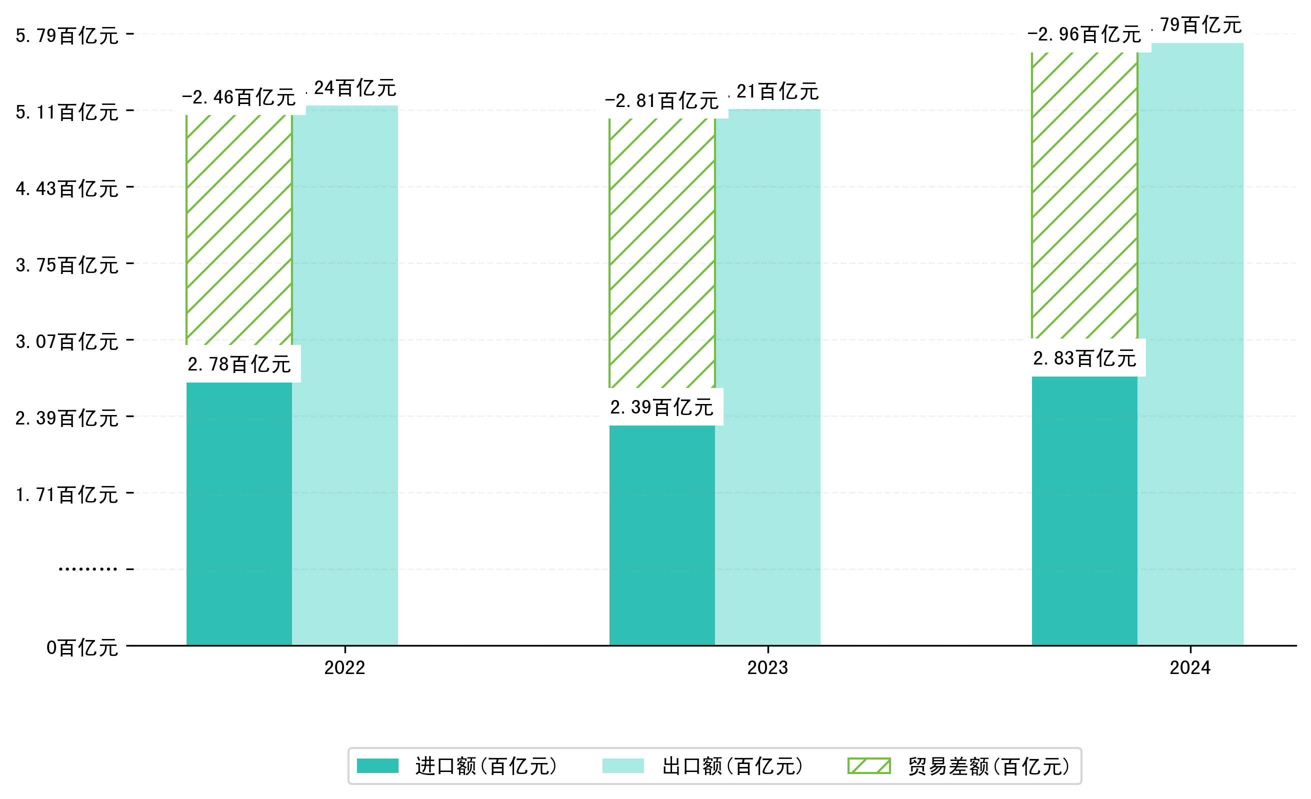 以人民币计,2024年1-12月贵州省贸易差额为296,1620,3389万元(贸易顺差),相比上年同期增加了14,8998,8118万元,同比增加5.3%。