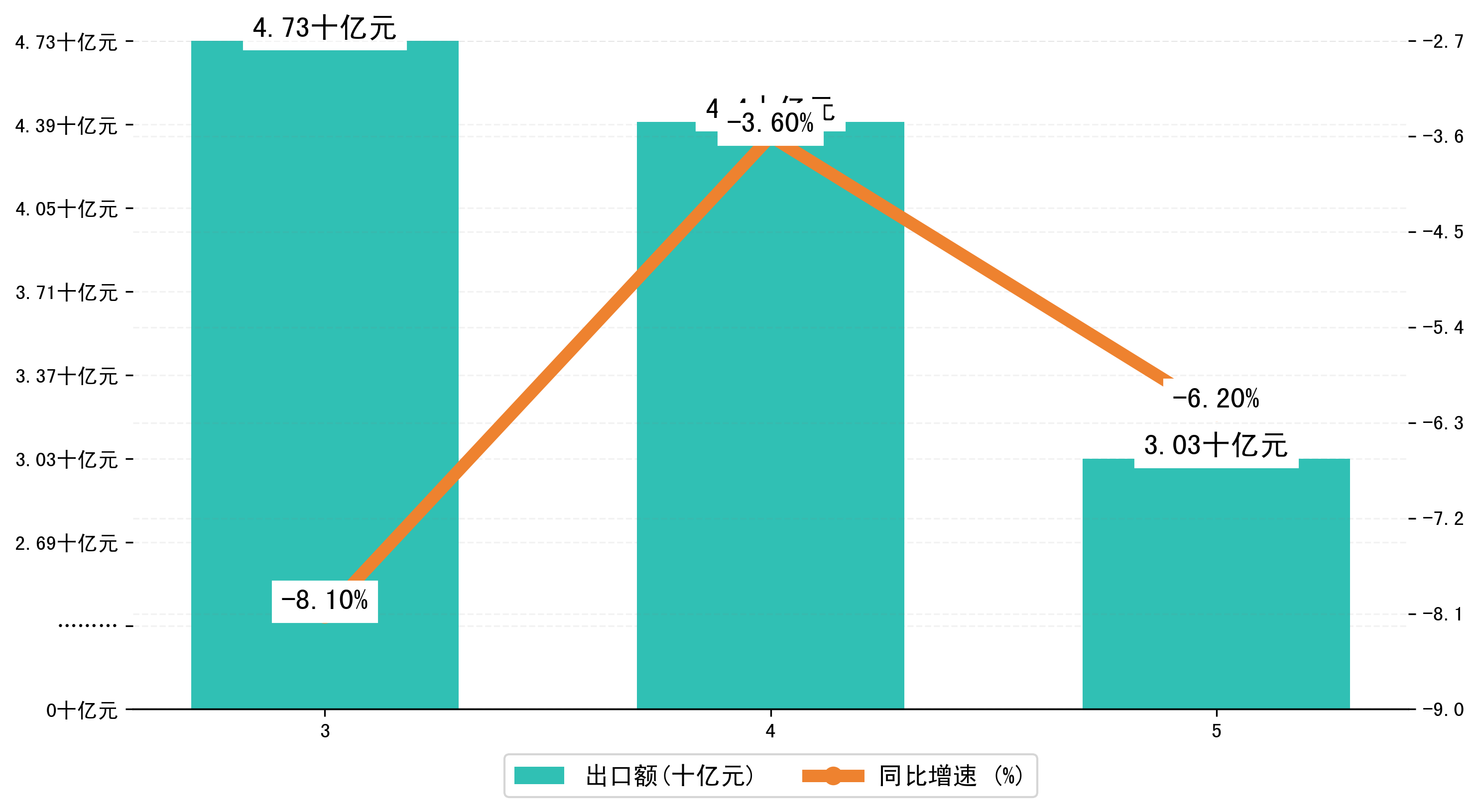 以人民币计,2025年5月贵州省出口额为30,3325.1147万元,相比上月减少了13,6374.027万元;相比上年同期减少了6,5520.9073万元,同比减少了-6.20%。