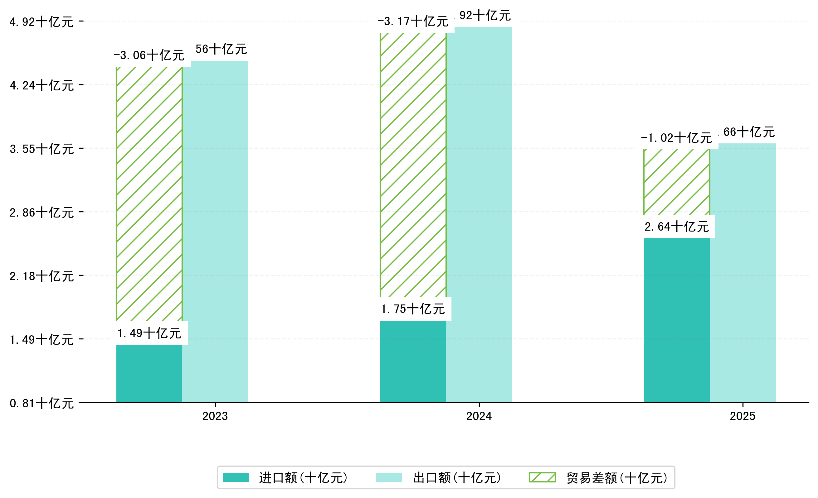 以人民币计,2025年1月贵州省贸易差额为10,2239,0081万元(贸易顺差),相比上月减少了83,5077,3229万元,即11,6347,3482万美元;相比上年同期减少了21,4473,4609万元,同比减少-67.72%。
