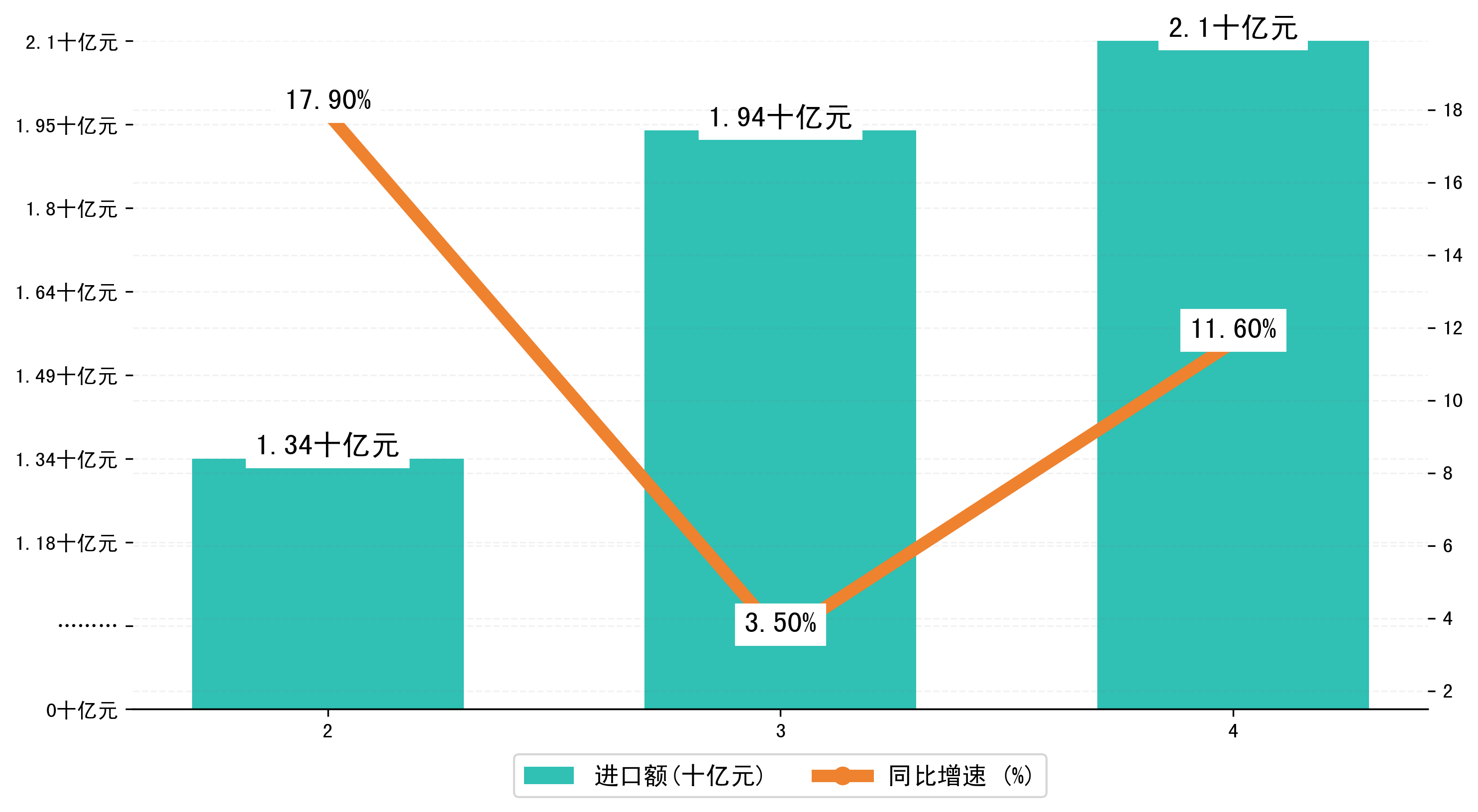 以美元计,2023年1-4月贵州省进口额为10,0093.3745万美元,相比上年同期增加了5899.7928万美元,同比增加3.50%。