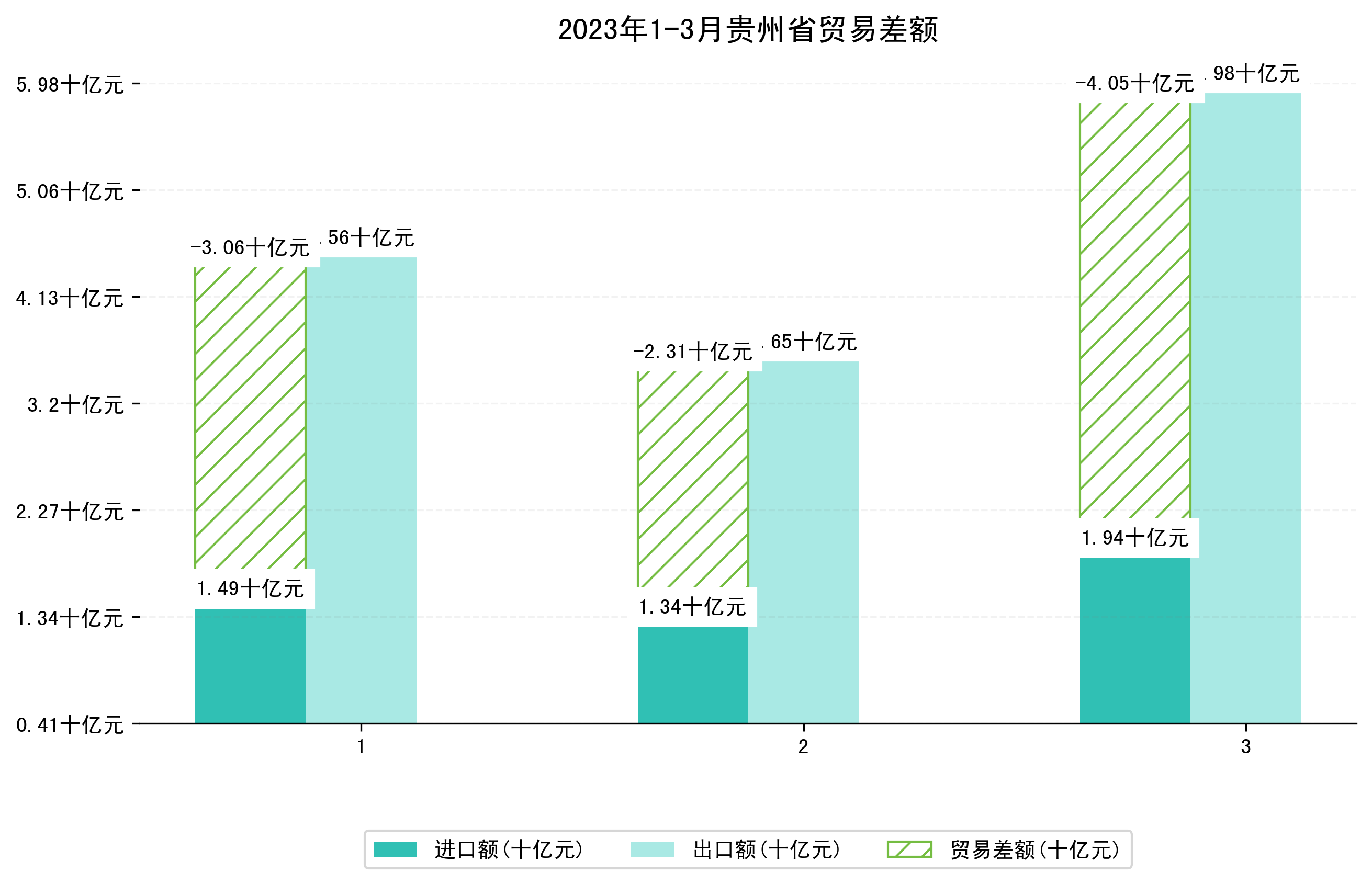 以人民币计,2023年1-3月贵州省贸易差额为94,1348,6318万元(贸易顺差),相比上年同期增加了64,9465,2960万元,同比增加222.51%。