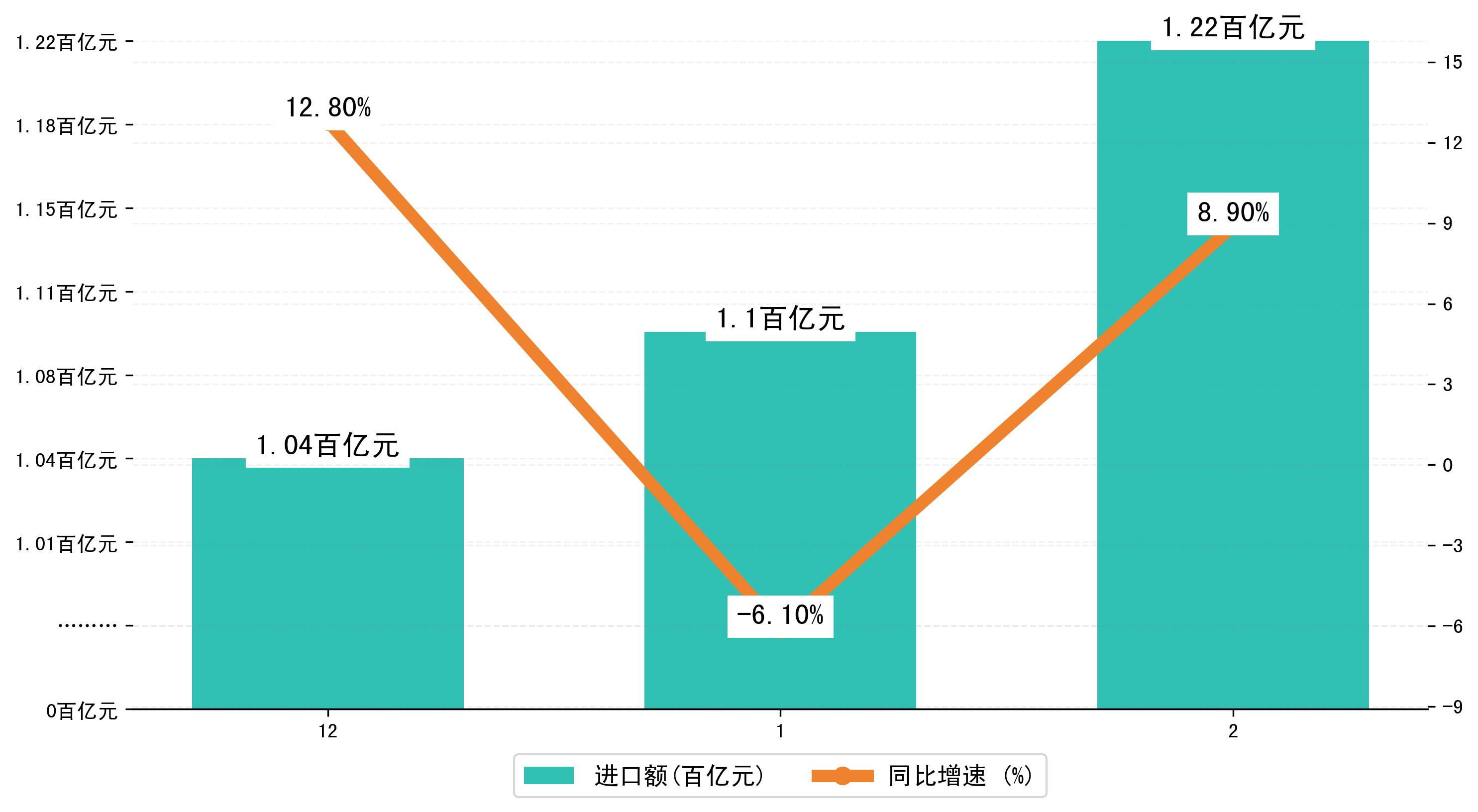 以人民币计,2023年2月海南省进口额为121,9149.2326万元,相比上月增加了12,1494.6225万元;相比上年同期增加了27,7977.2223万元,同比增加了8.90%。