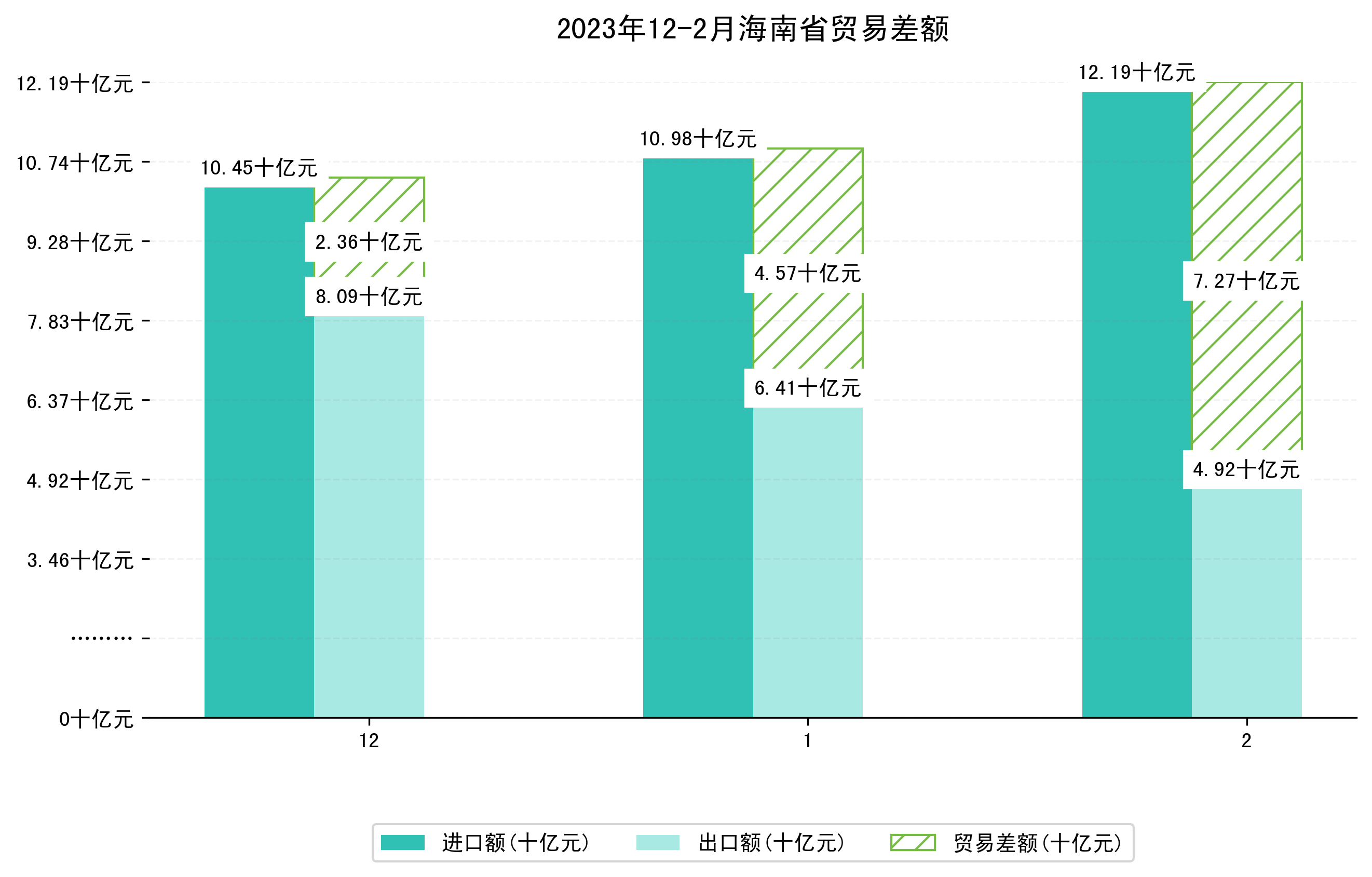 以人民币计,2023年2月海南省贸易差额为72,7420,1311万元(贸易逆差),相比上月减少了27,0638,2448万元,即4,1459,9209万美元;相比上年同期减少了5,0454,4829万元,同比减少7.45%。
