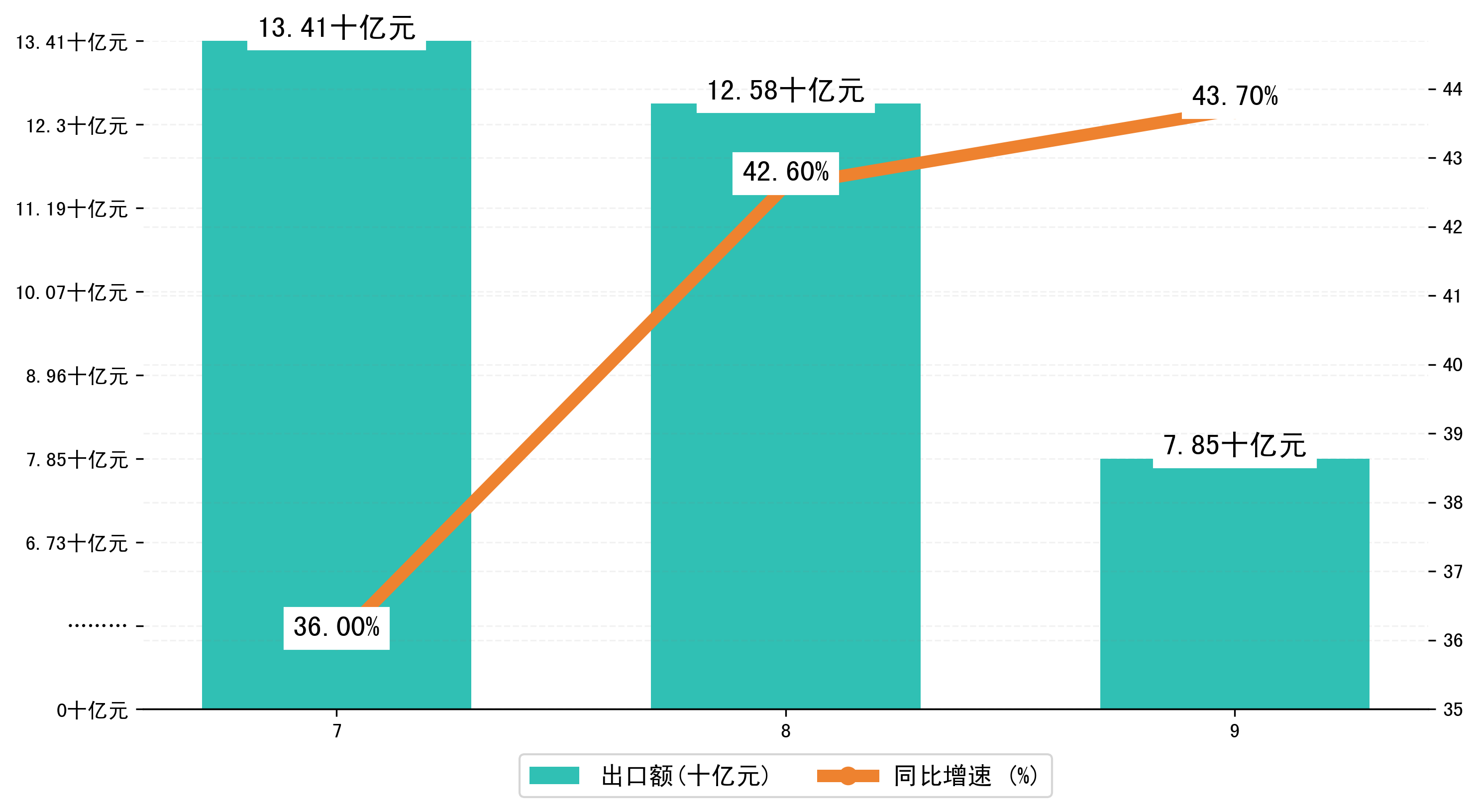 以人民币计,2024年1-9月海南省出口额为793,6033.7188万元,相比上年同期增加了239,4936.0446万元,同比增加了43.70%。