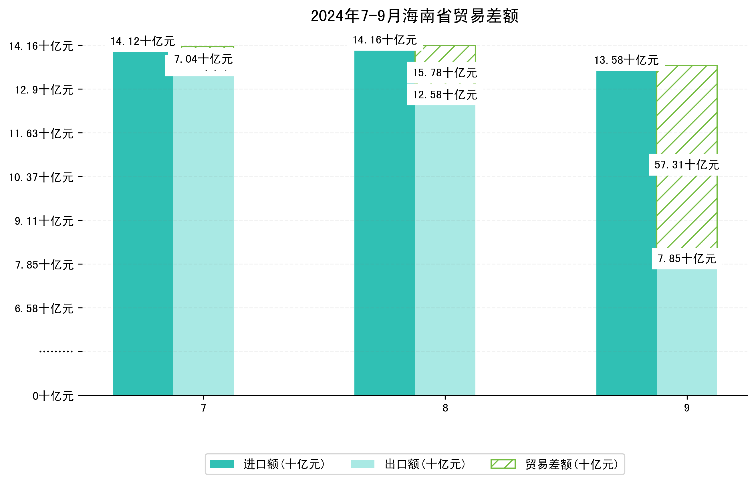 以人民币计,2024年9月海南省贸易差额为57,3056,6231万元(贸易逆差),相比上月减少了41,5211,1872万元,即5,8284,9246万美元;相比上年同期增加了35,5072,9797万元,同比增加-38.26%。