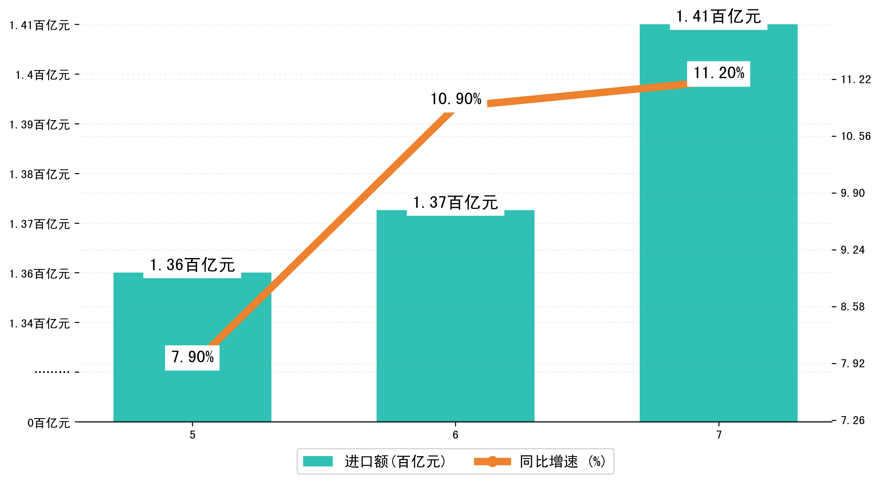 以美元计,2024年1-7月海南省进口额为139,3514.3256万美元,相比上年同期增加了9,9097.428万美元,同比增加8.30%。