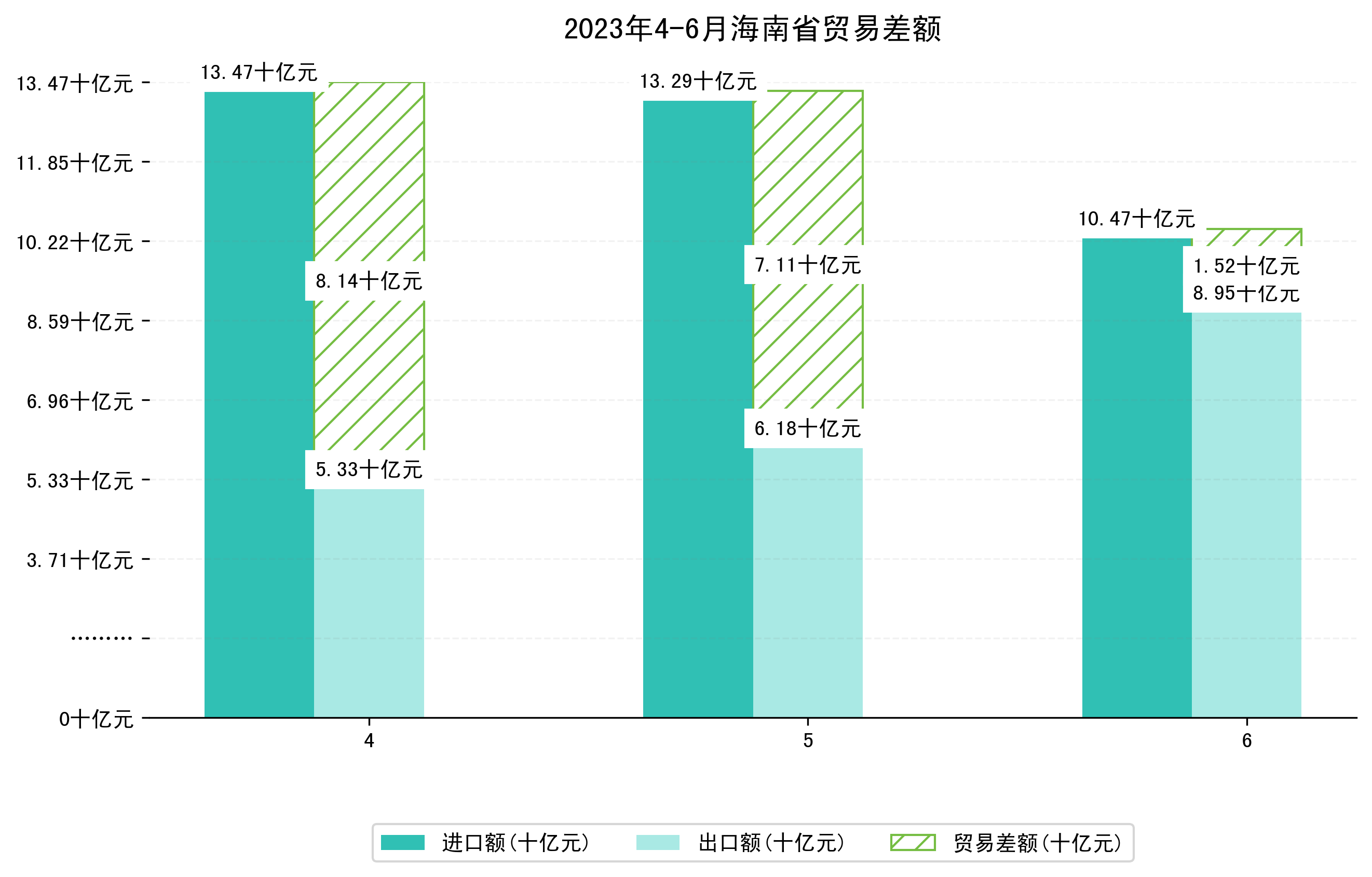 以美元计,2023年1-6月海南省贸易差额为56,3937,0545万美元(贸易逆差),相比上年同期增加了4,2946,4973万美元,同比增加-7.08%。