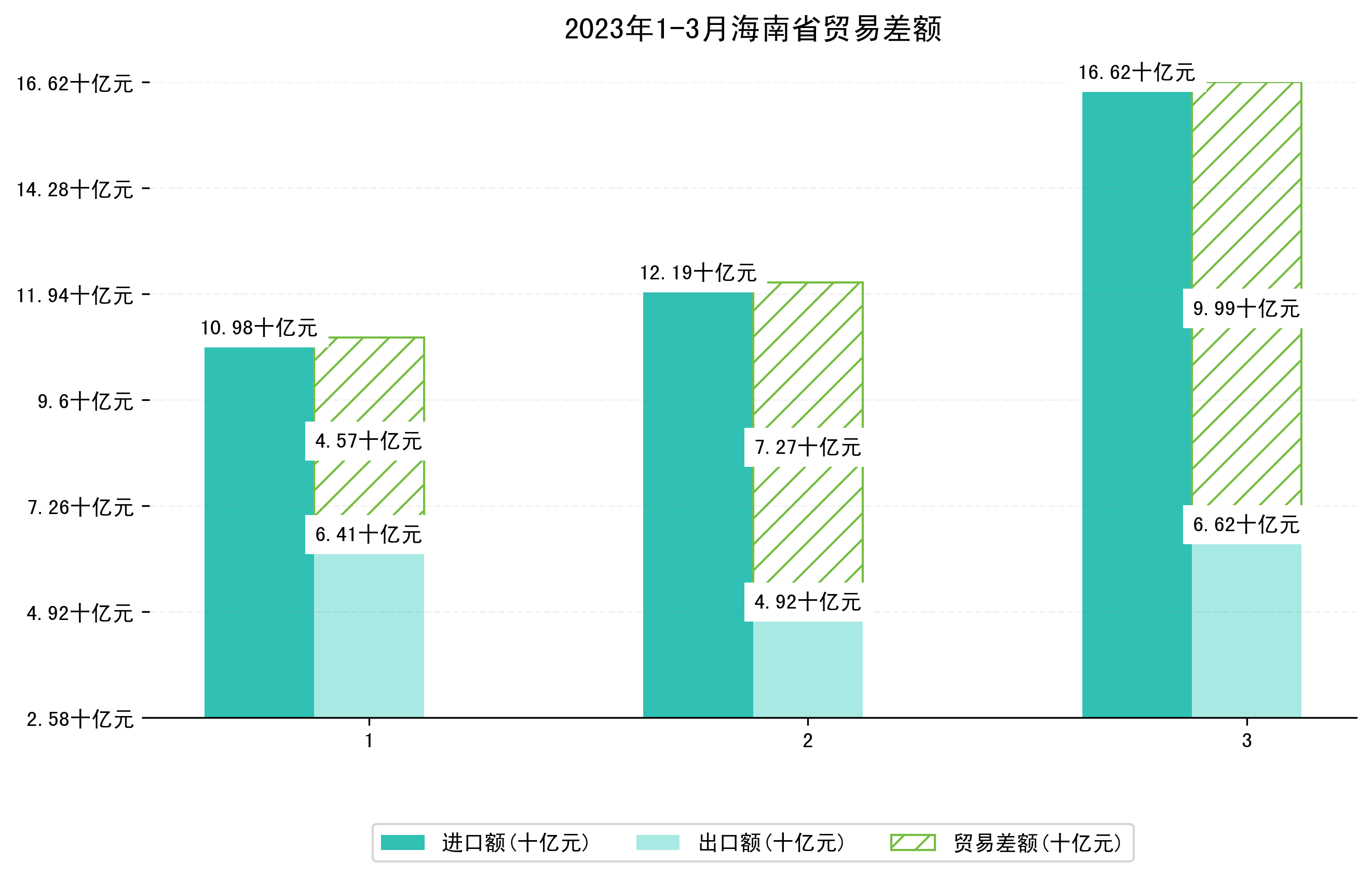 以人民币计,2023年3月海南省贸易差额为99,9117,5828万元(贸易逆差),相比上月减少了27,1697,4517万元,即3,8978,3267万美元;相比上年同期减少了8,5018,0173万元,同比减少9.3%。