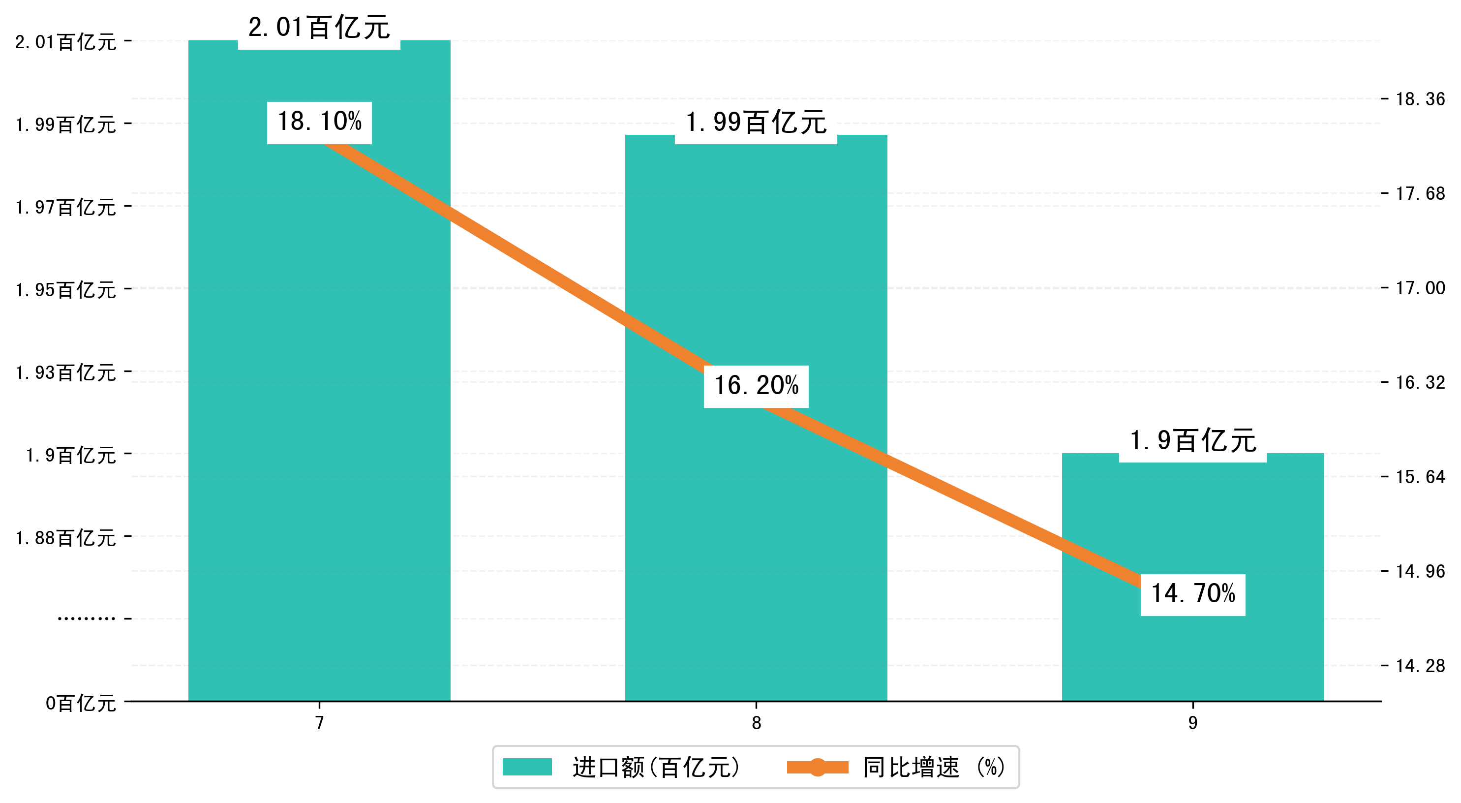 以人民币计,2024年9月河北省进口额为190,2997.6418万元,相比上月减少了8,5053.8688万元;相比上年同期增加了12,2293.8511万元,同比增加了14.70%。