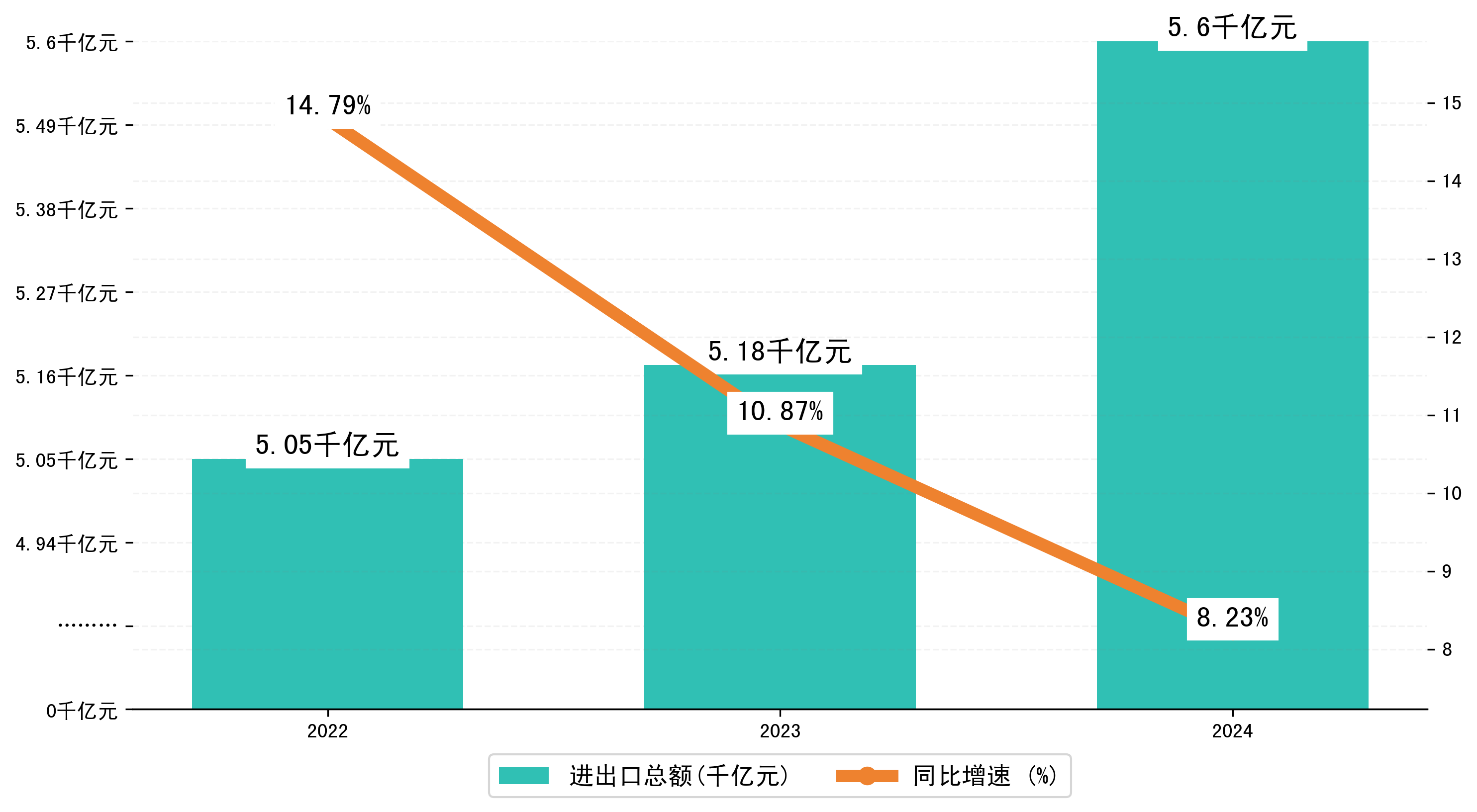 以人民币计,2024年1-11月河北省进出口总额为5601,9172.7708万元,相比上年同期增加了425,9539.7482万元,同比增加了8.10%。