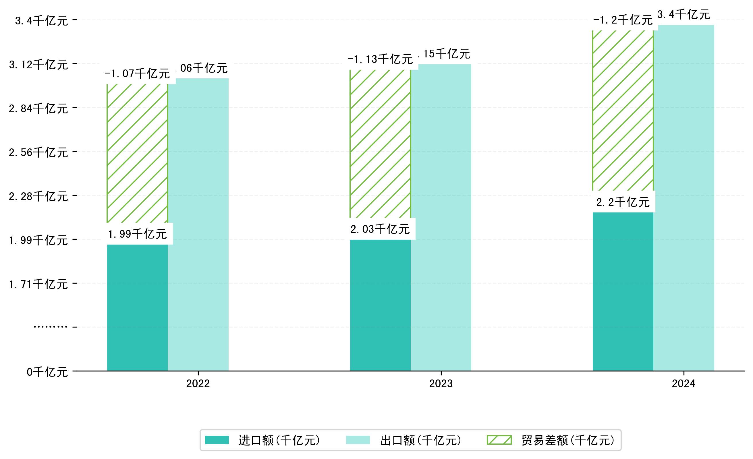 以人民币计,2024年1-11月河北省贸易差额为1203,6600,7991万元(贸易顺差),相比上年同期增加了78,3865,4288万元,同比增加6.97%。