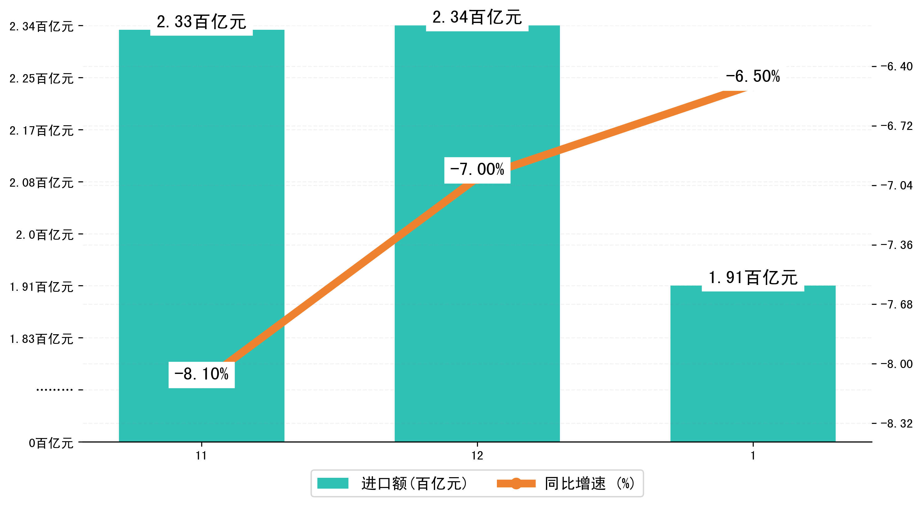以人民币计,2023年1-1月河北省进口额为191,3879.8247万元,相比上年同期增加了1,5908.4069万元,同比减少了-6.50%。