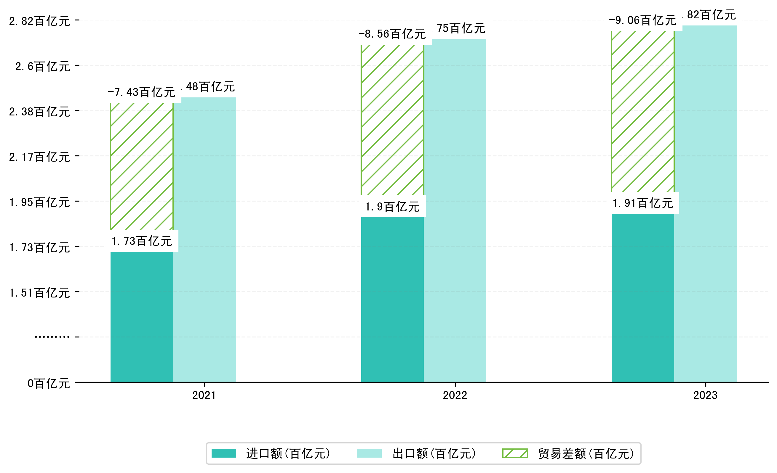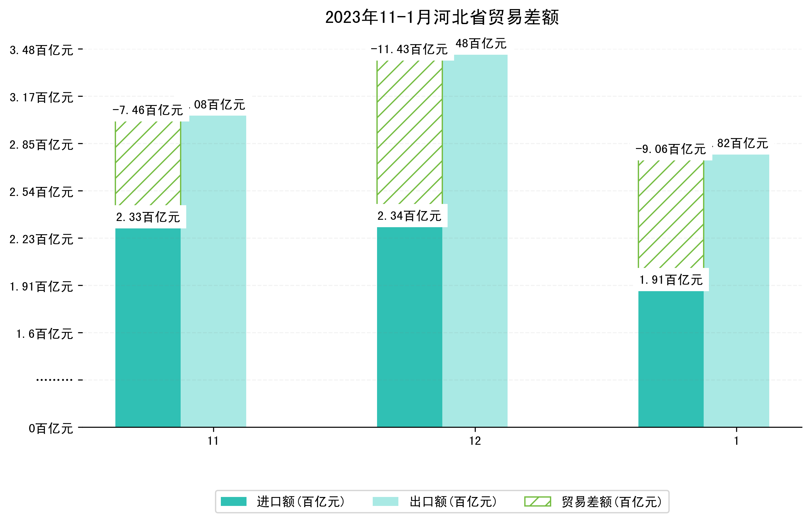 以人民币计,2023年1月河北省贸易差额为90,6023,9609万元(贸易顺差),相比上月减少了23,6712,7048万元,即3,2254,7263万美元;相比上年同期增加了4,9528,9373万元,同比增加5.78%。