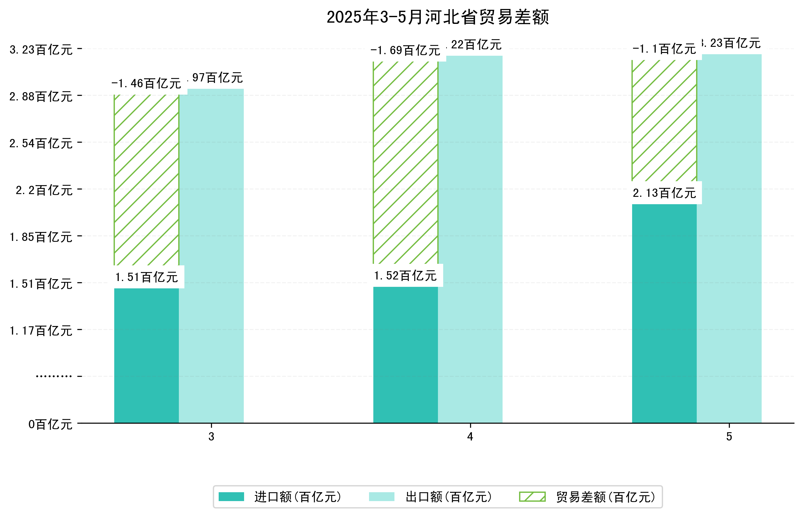 以美元计,2025年1-5月河北省贸易差额为81,2435,3714万美元(贸易顺差),相比上年同期增加了13,3431,2272万美元,同比增加19.65%。