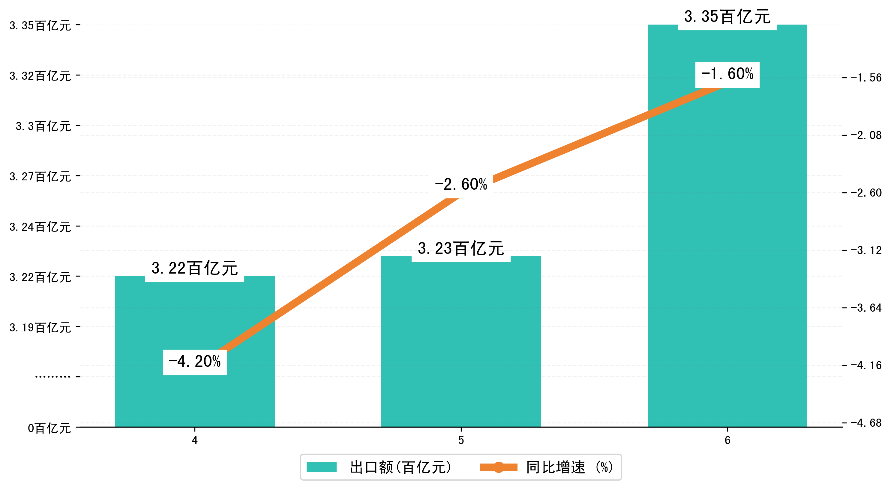 以人民币计,2025年6月河北省出口额为335,0246.0569万元,相比上月增加了12,3452.4442万元;相比上年同期增加了10,2720.0525万元,同比减少了-1.60%。