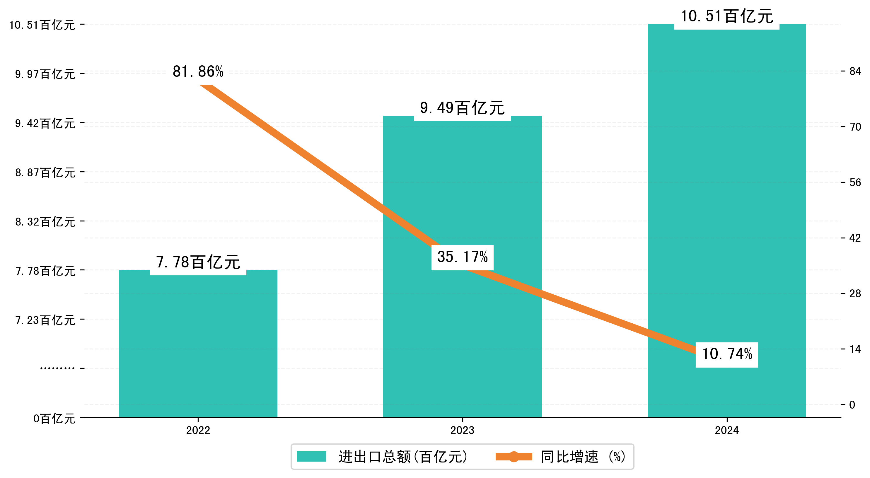 以人民币计,2024年1-4月黑龙江省进出口总额为1051,2333.5527万元,相比上年同期增加了101,9113.4106万元,同比增加了10.50%。