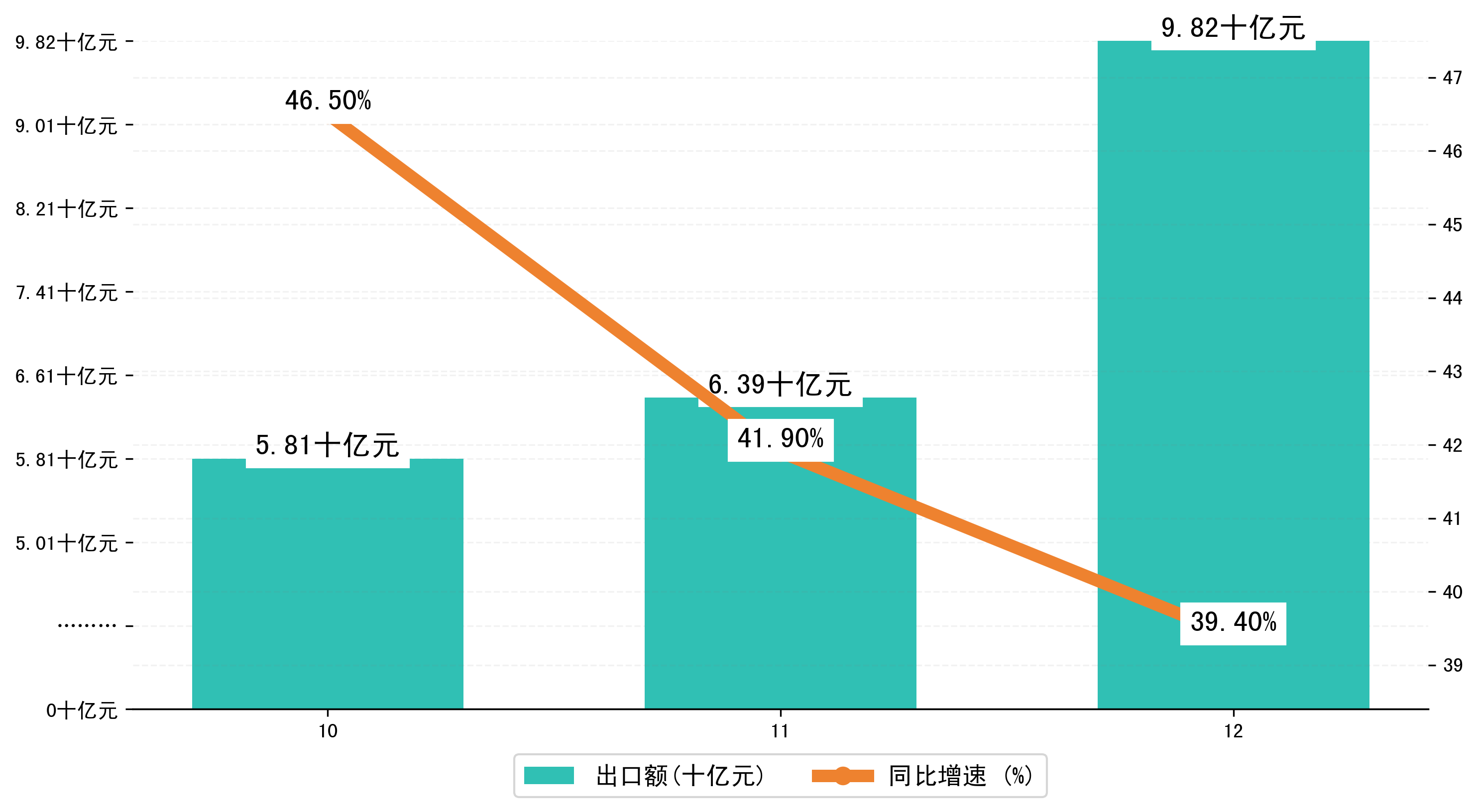 以人民币计,2023年12月黑龙江省出口额为98,1625.9593万元,相比上月增加了34,2265.8931万元;相比上年同期增加了19,3445.1982万元,同比增加了39.40%。