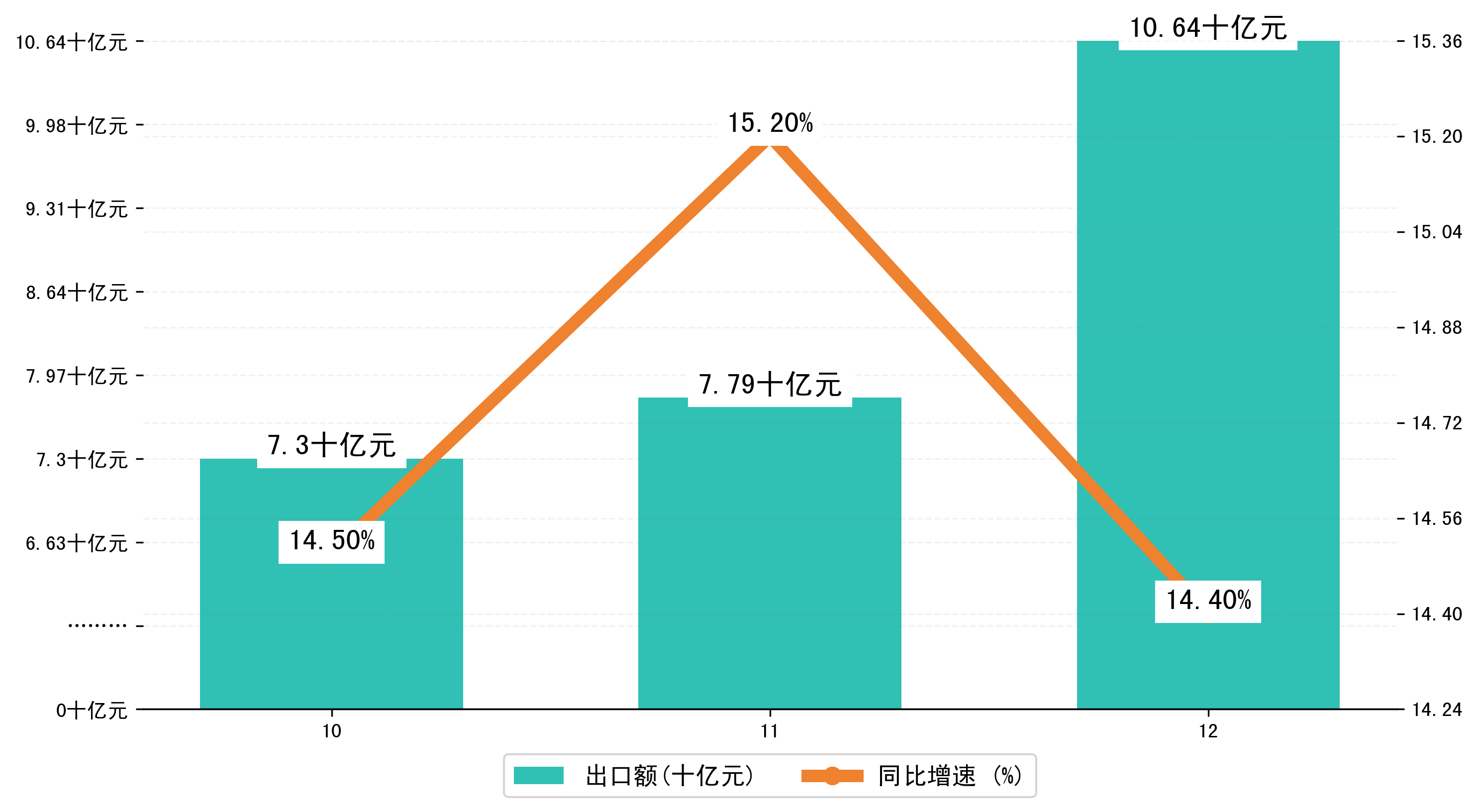 以人民币计,2024年1-12月黑龙江省出口额为869,7059.987万元,相比上年同期增加了109,1049.0047万元,同比增加了14.40%。