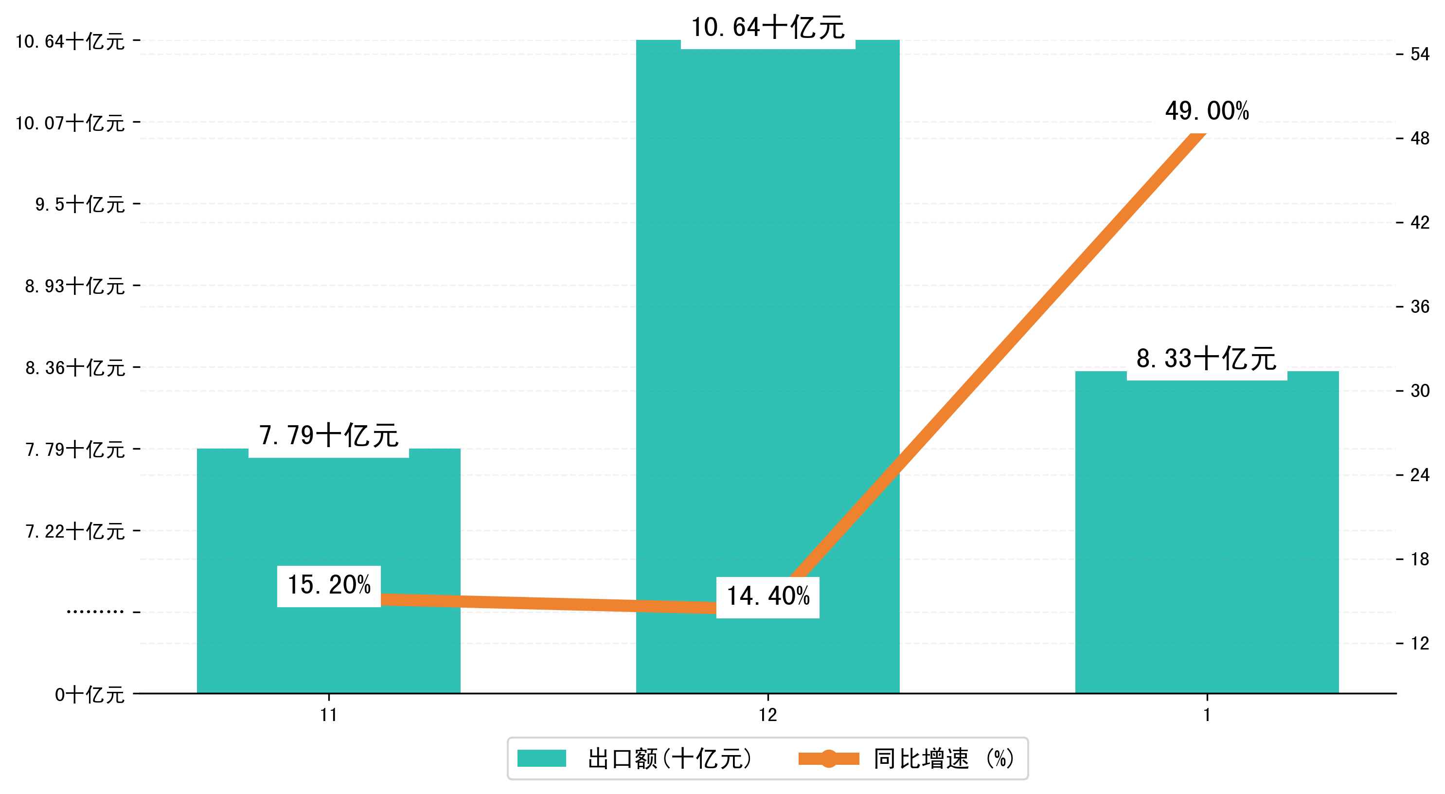 以人民币计,2025年1-1月黑龙江省出口额为83,2697.1396万元,相比上年同期增加了27,3429.9724万元,同比增加了49.00%。