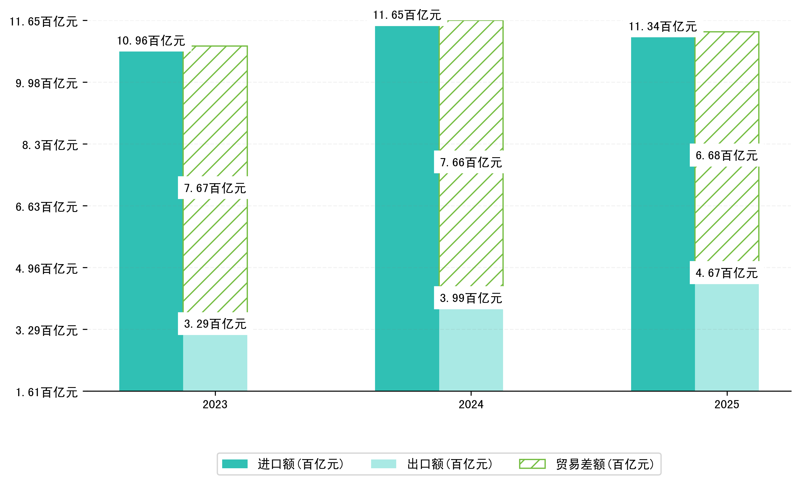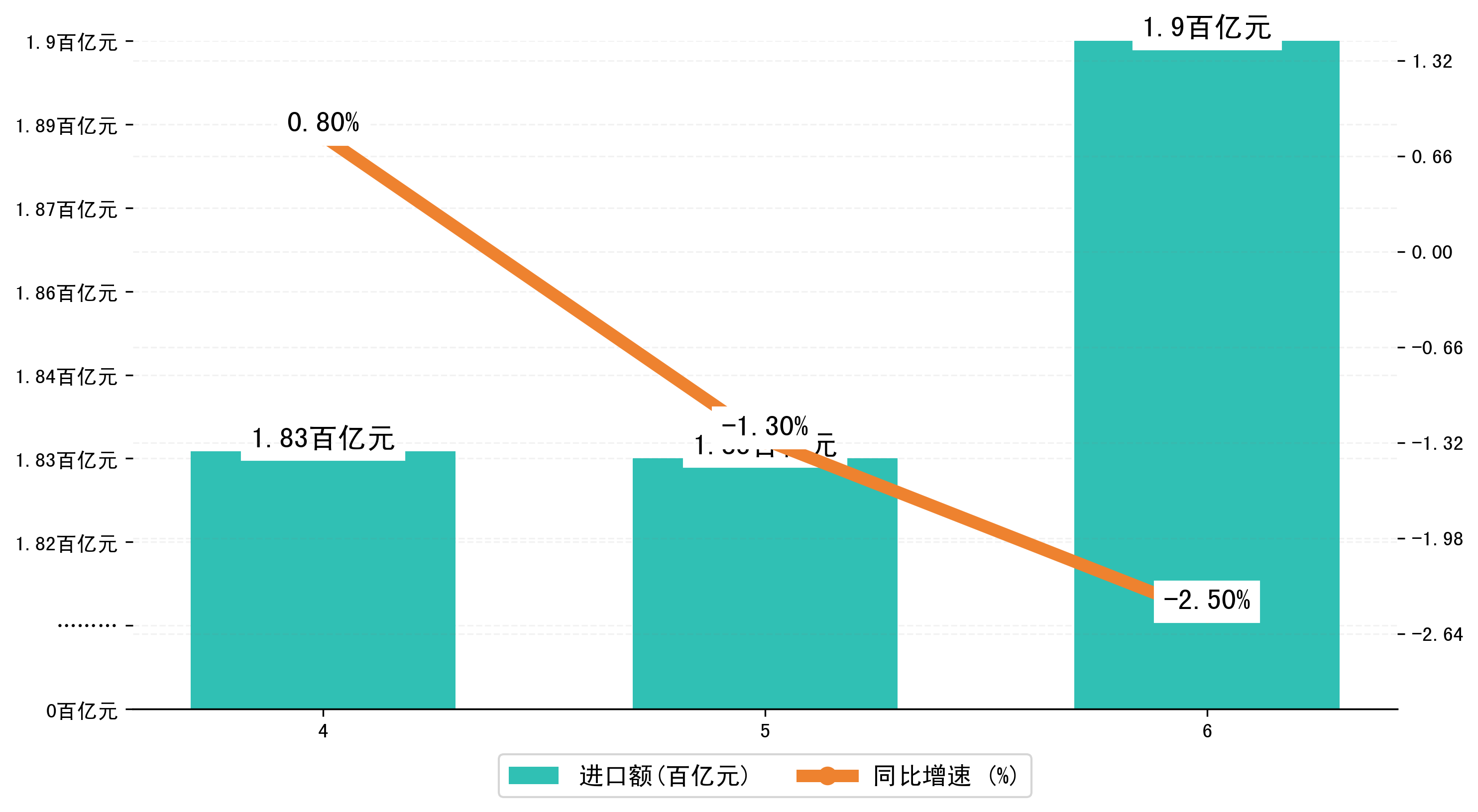 以人民币计,2025年6月黑龙江省进口额为190,0122.6255万元,相比上月增加了7,0325.0698万元;相比上年同期减少了11,3406.703万元,同比减少了-2.50%。