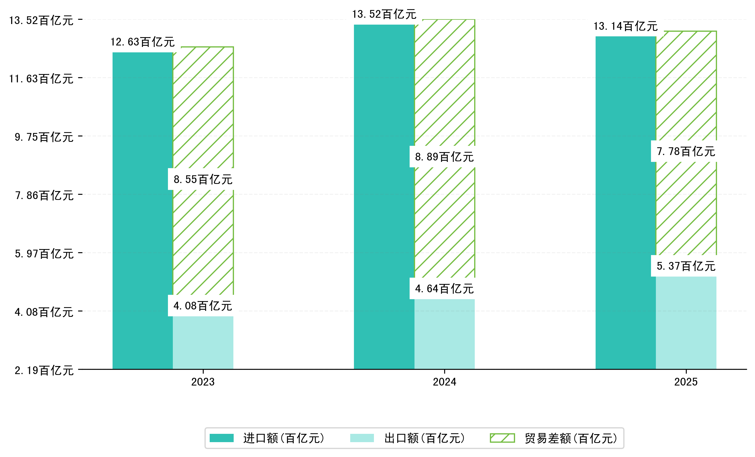 以人民币计,2025年1-7月黑龙江省贸易差额为777,8039,9013万元(贸易逆差),相比上年同期增加了111,0138,7682万元,同比增加-12.49%。