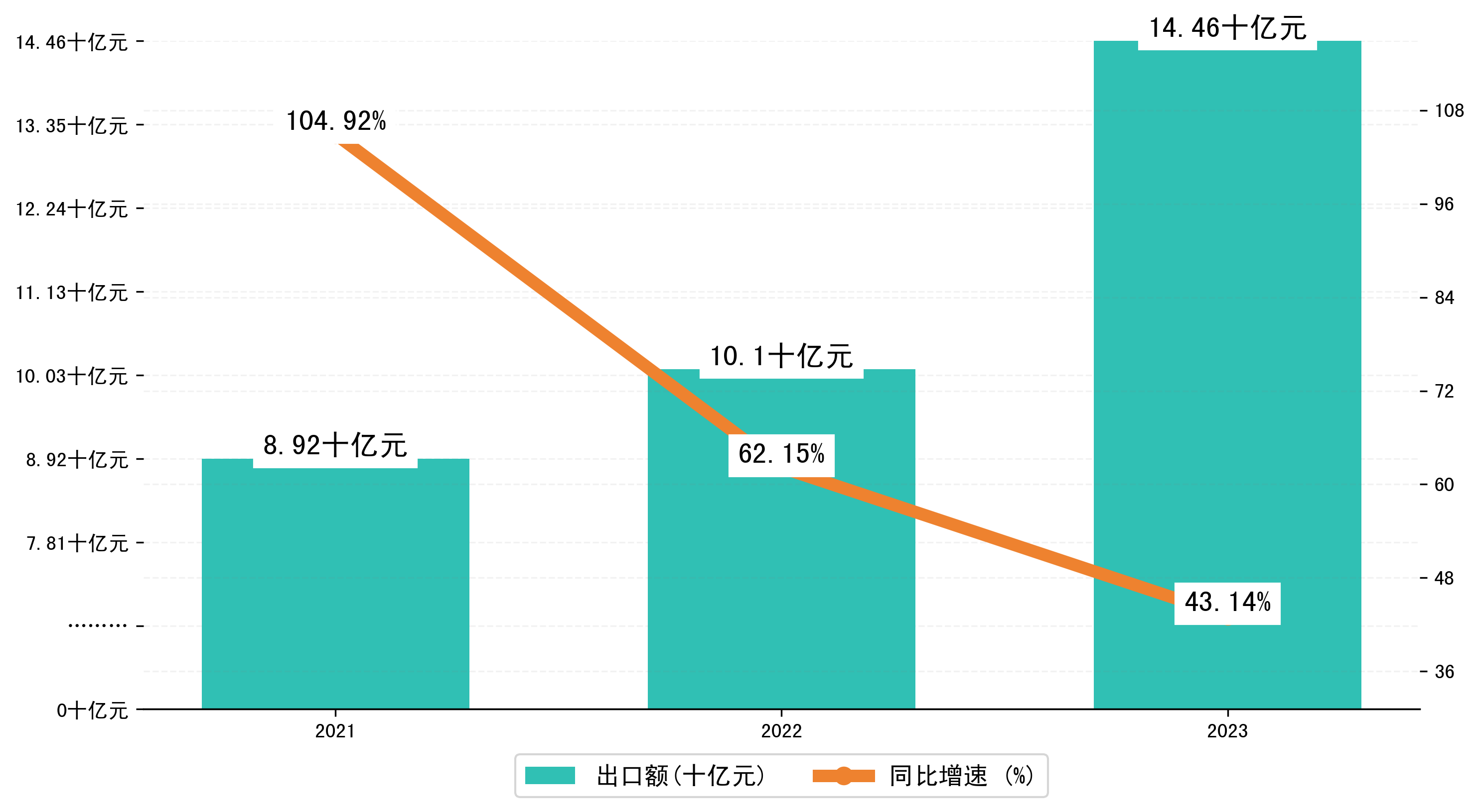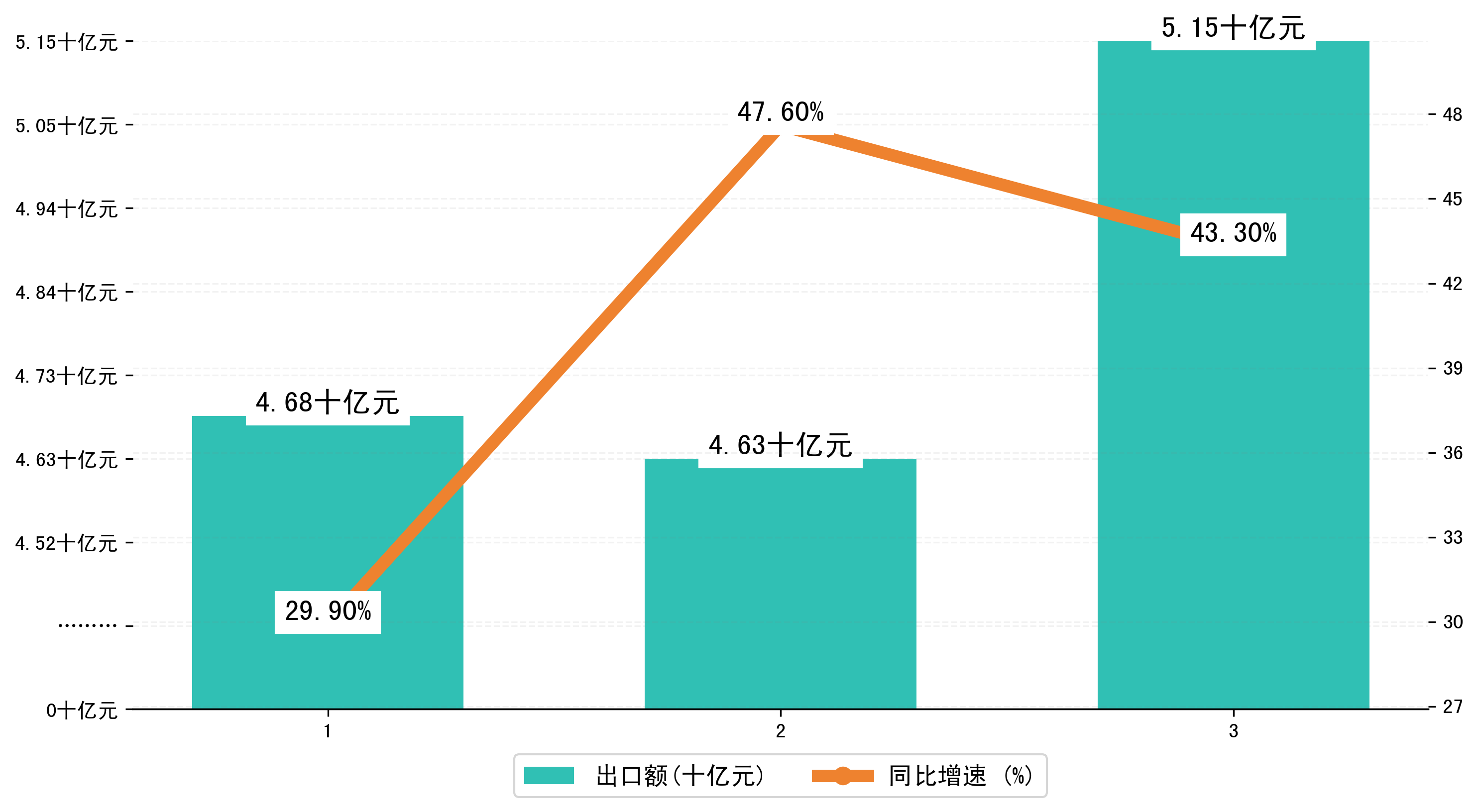 以人民币计,2023年1-3月黑龙江省出口额为144,5899.6188万元,相比上年同期增加了43,5763.5055万元,同比增加了43.30%。