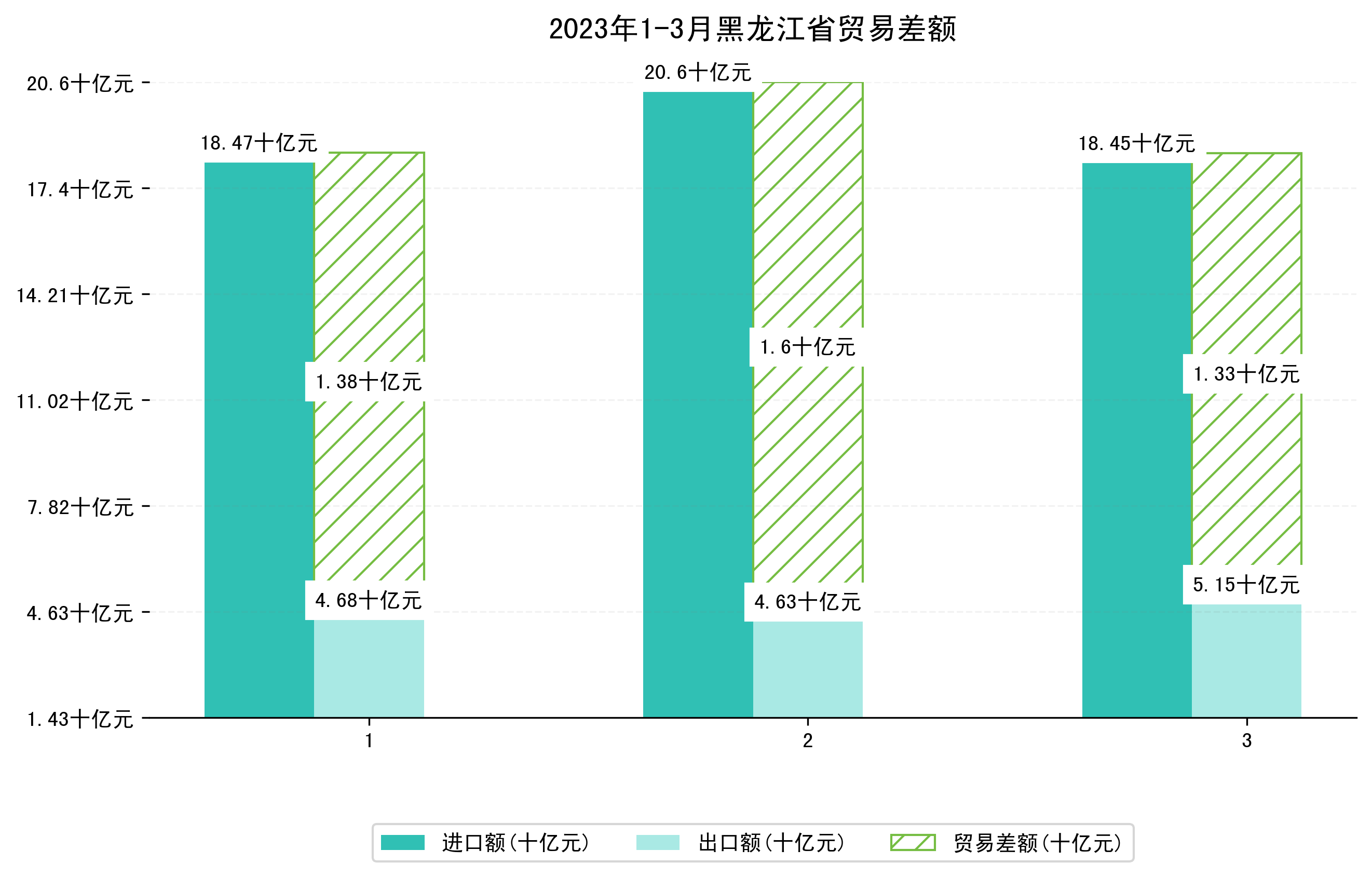 以美元计,2023年1-3月黑龙江省贸易差额为62,7878,3306万美元(贸易逆差),相比上年同期减少了7,8296,7920万美元,同比减少14.25%。
