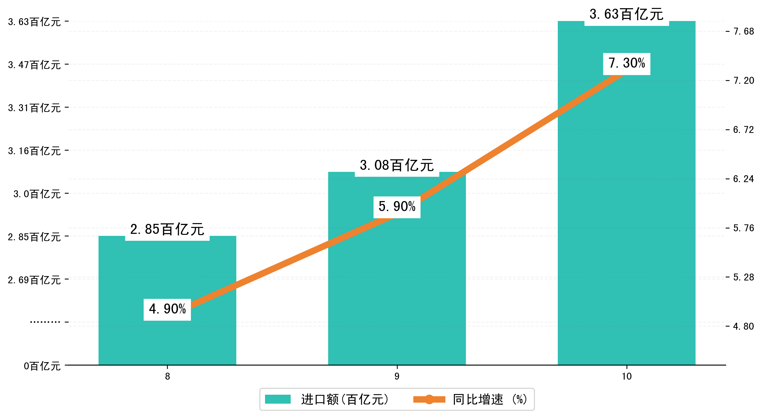 以美元计,2024年1-10月河南省进口额为347,2172.7944万美元,相比上年同期增加了19,0982.6885万美元,同比增加5.90%。