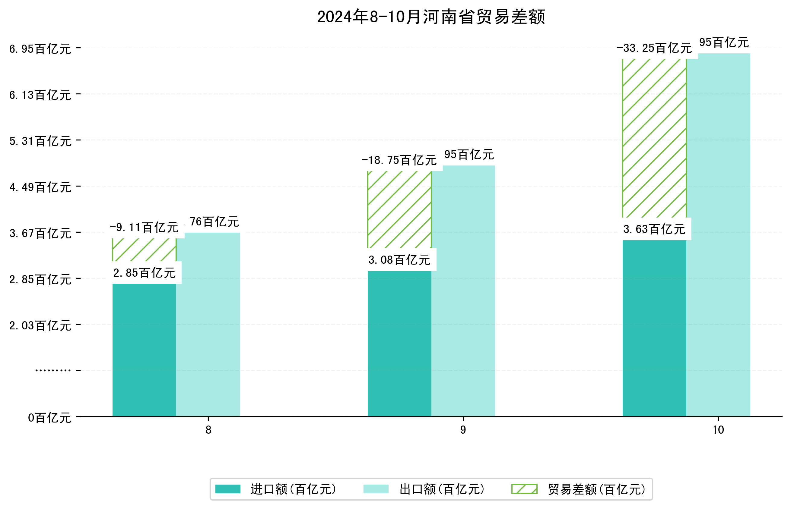 以人民币计,2024年10月河南省贸易差额为332,4609,4763万元(贸易顺差),相比上月增加了144,9992,9332万元,即20,5249,3429万美元;相比上年同期增加了101,2247,0831万元,同比增加43.78%。