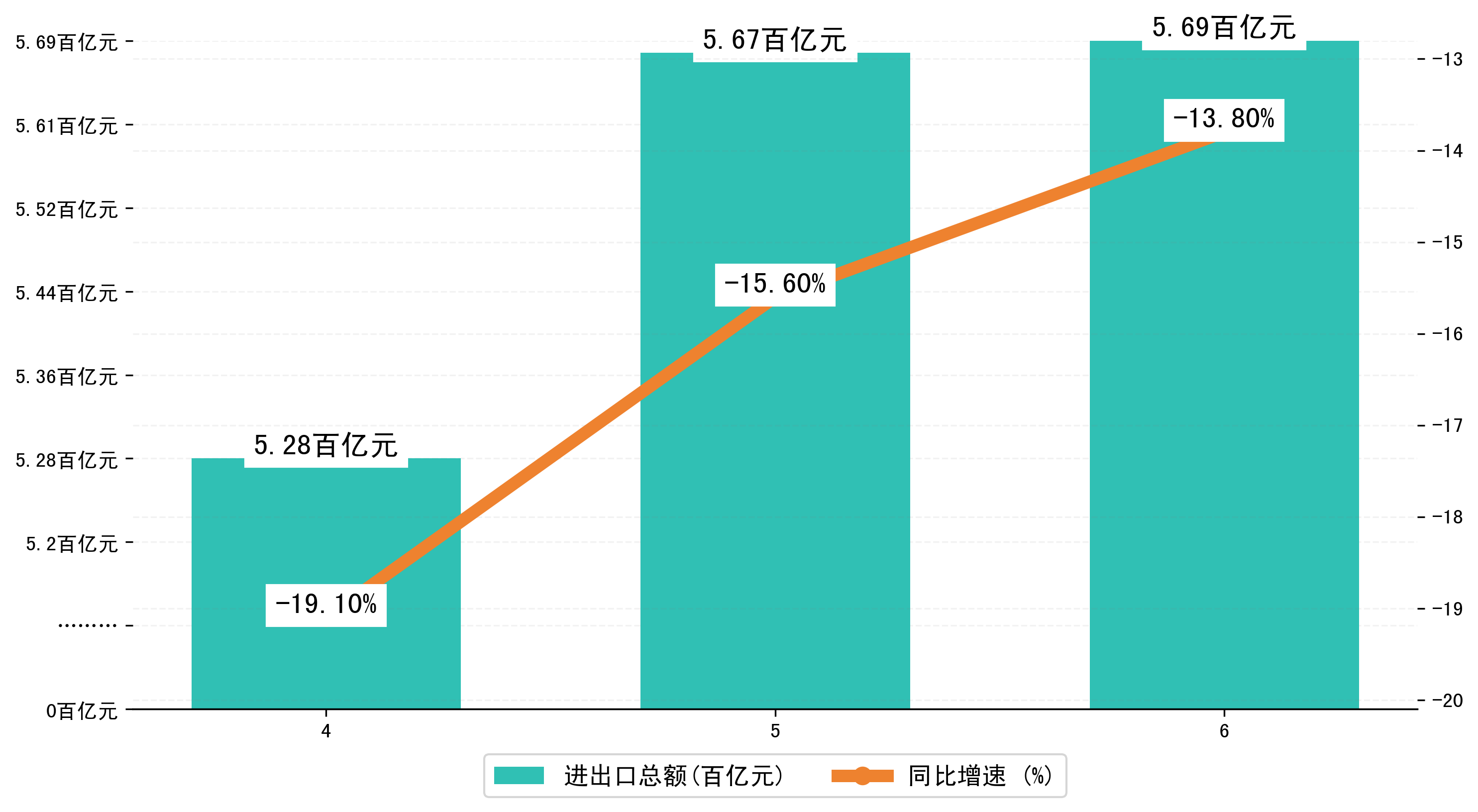 以人民币计,2024年6月河南省进出口总额为568,6581.385万元,相比上月增加了1,1698.1706万元;相比上年同期减少了27,1517.5876万元,同比减少了-13.80%。