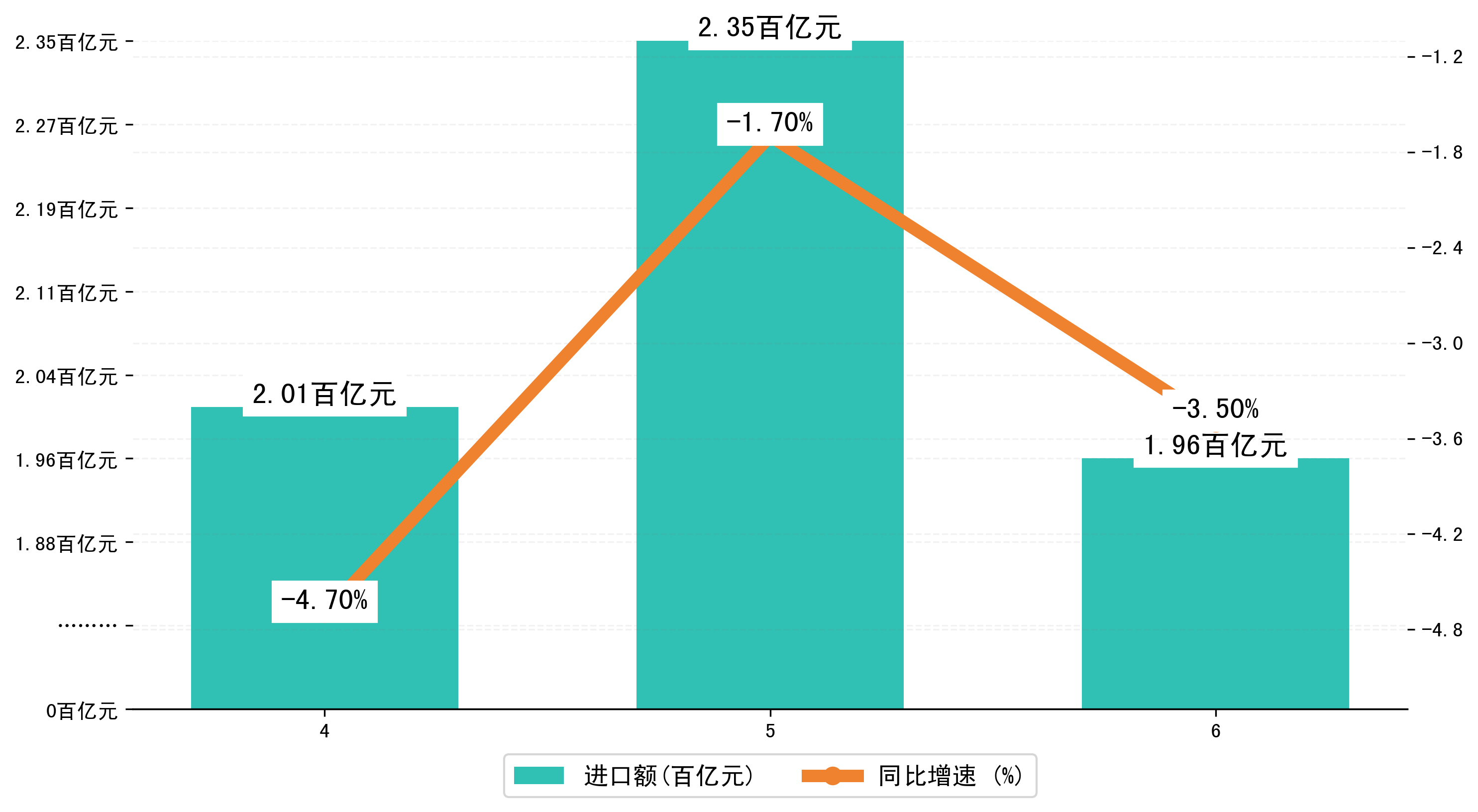 以美元计,2024年1-6月河南省进口额为175,2651.6419万美元,相比上年同期减少了12,4051.8731万美元,同比减少-6.30%。