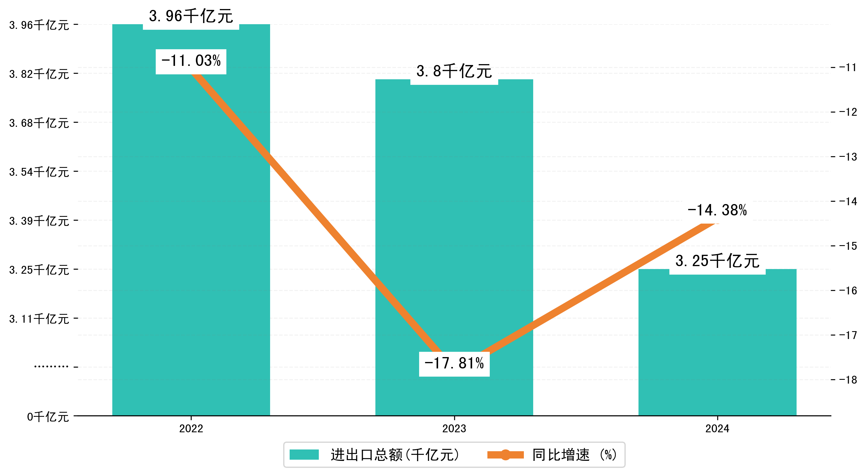 以人民币计,2024年1-6月河南省进出口总额为3253,1752.4975万元,相比上年同期减少了546,3170.6153万元,同比减少了-13.80%。