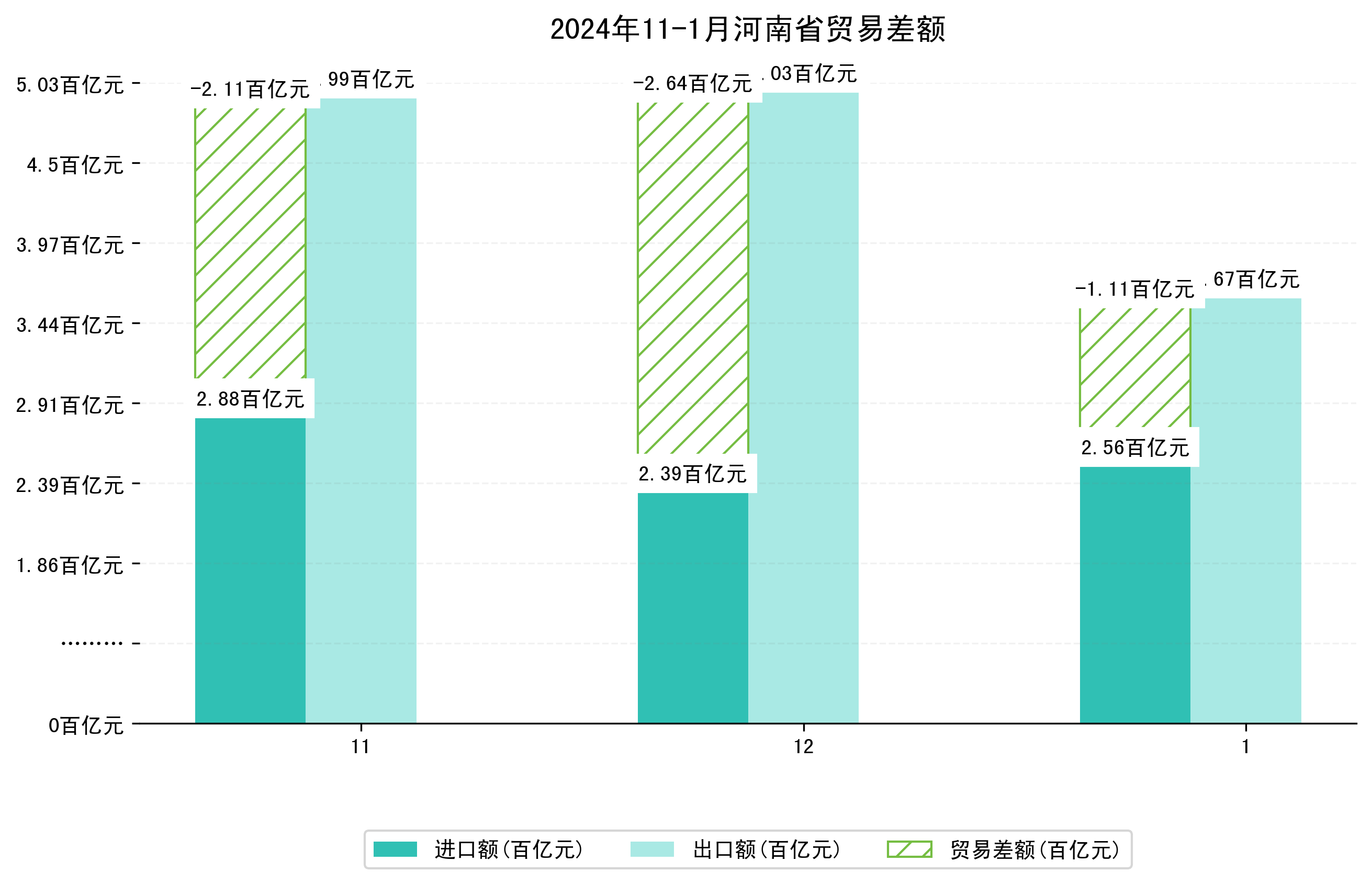 以人民币计,2024年1-1月河南省贸易差额为111,3083,0711万元(贸易顺差),相比上年同期减少了220,3306,3040万元,同比减少-66.44%。