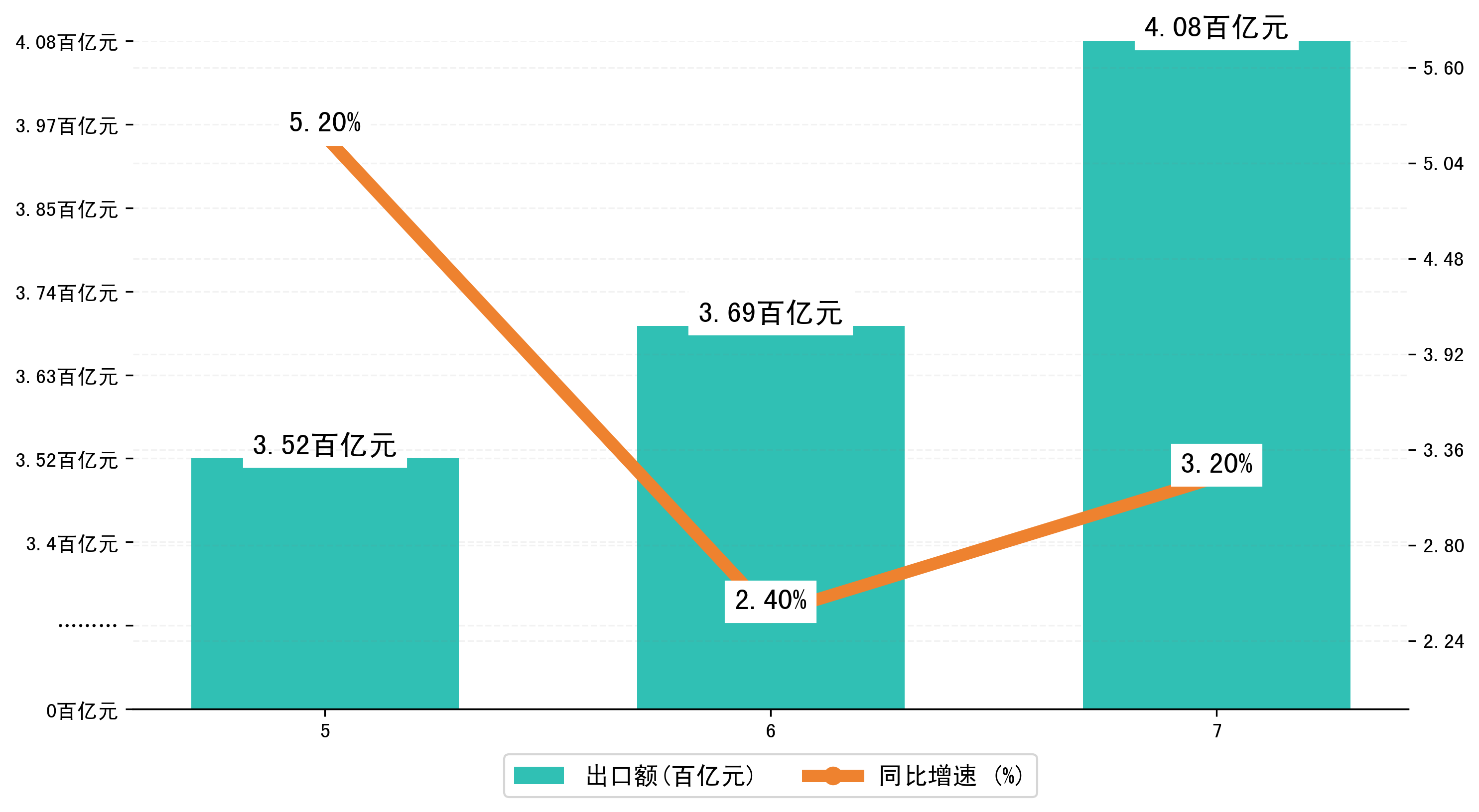 以人民币计,2023年7月河南省出口额为407,9491.1735万元,相比上月增加了38,5305.6426万元;相比上年同期增加了37,2015.1996万元,同比增加了3.20%。