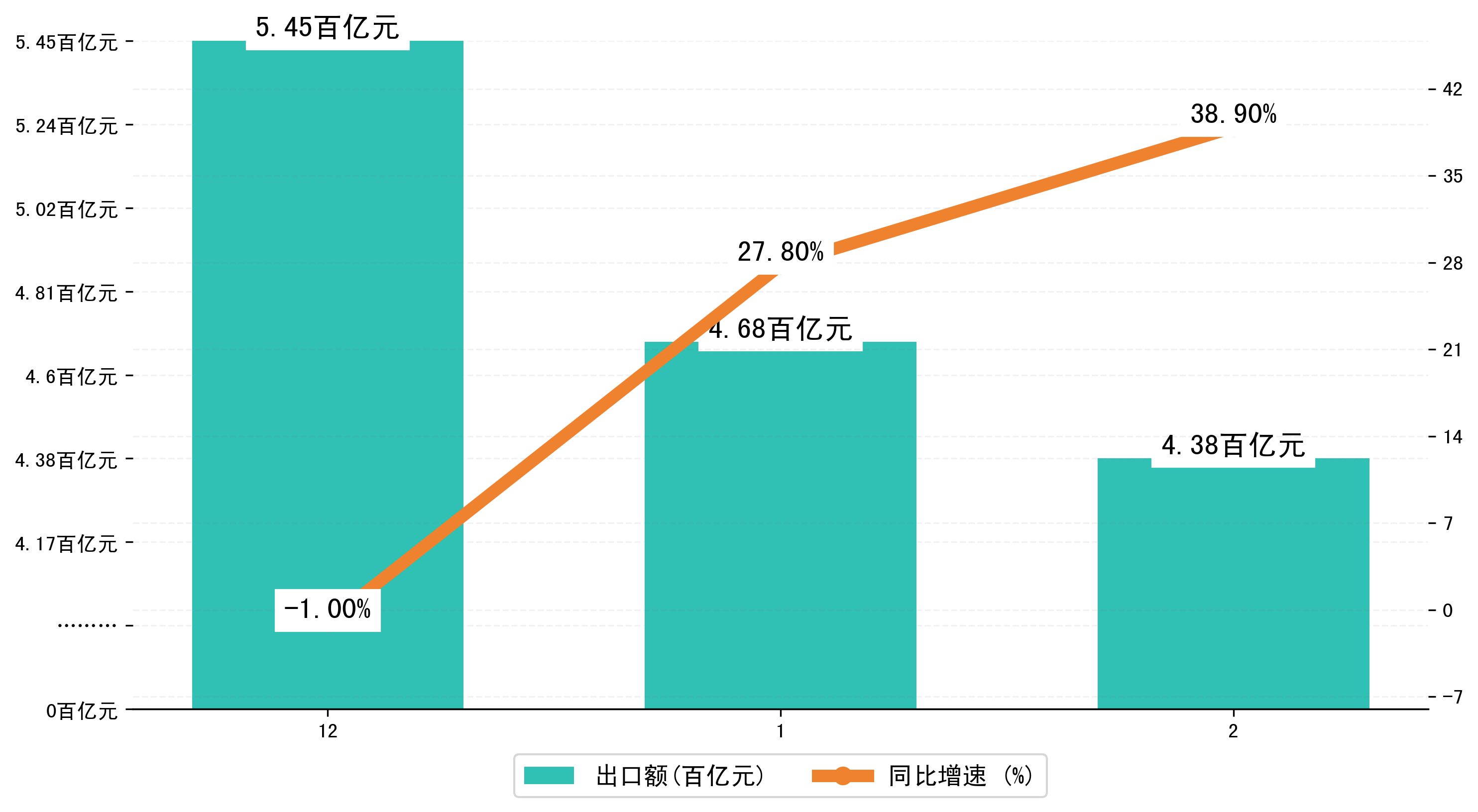 以人民币计,2025年2月河南省出口额为438,3115.2079万元,相比上月减少了29,7508.3524万元;相比上年同期增加了153,6273.3729万元,同比增加了38.90%。