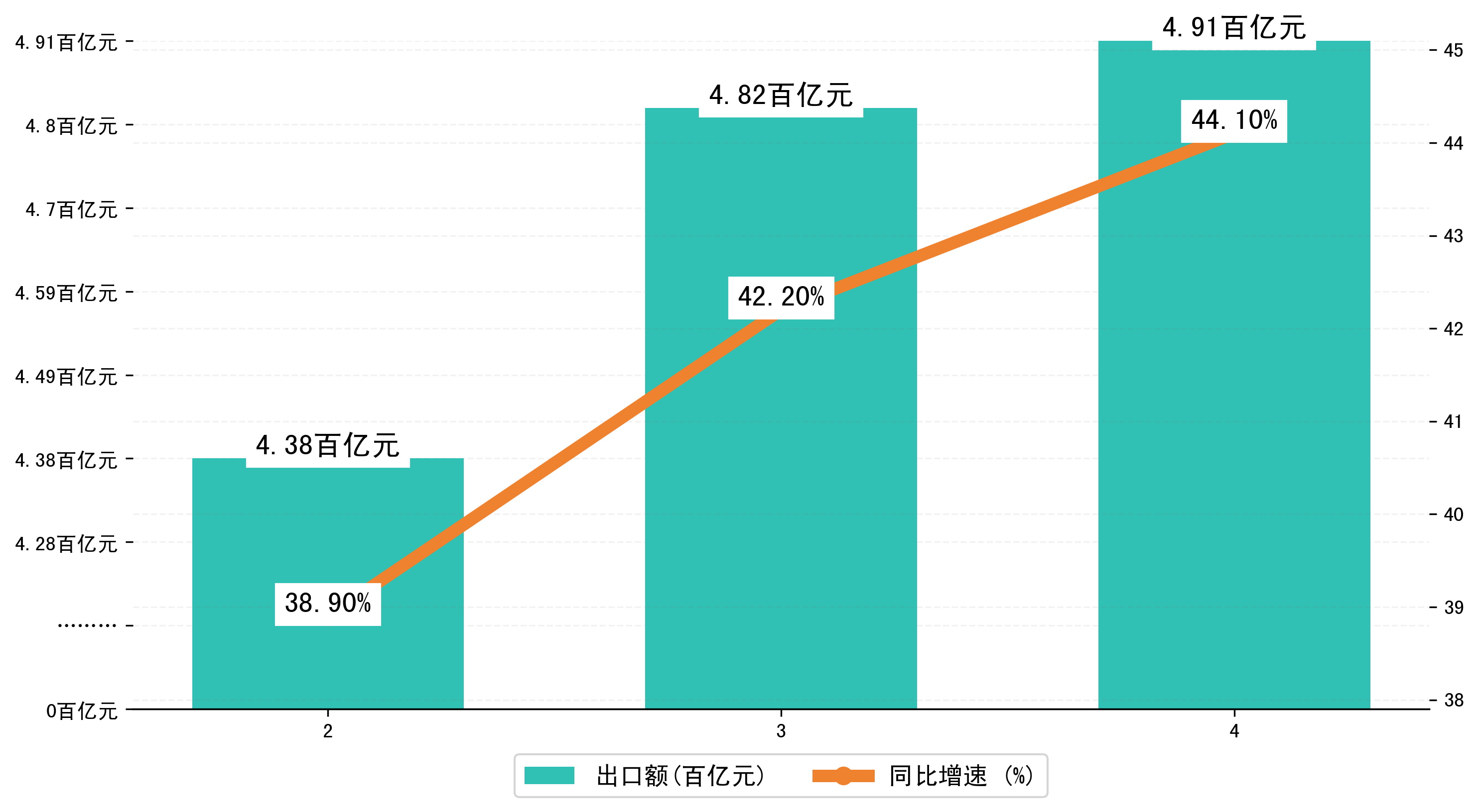 以美元计,2025年1-4月河南省出口额为261,7446.0804万美元,相比上年同期增加了78,3548.0478万美元,同比增加42.50%。