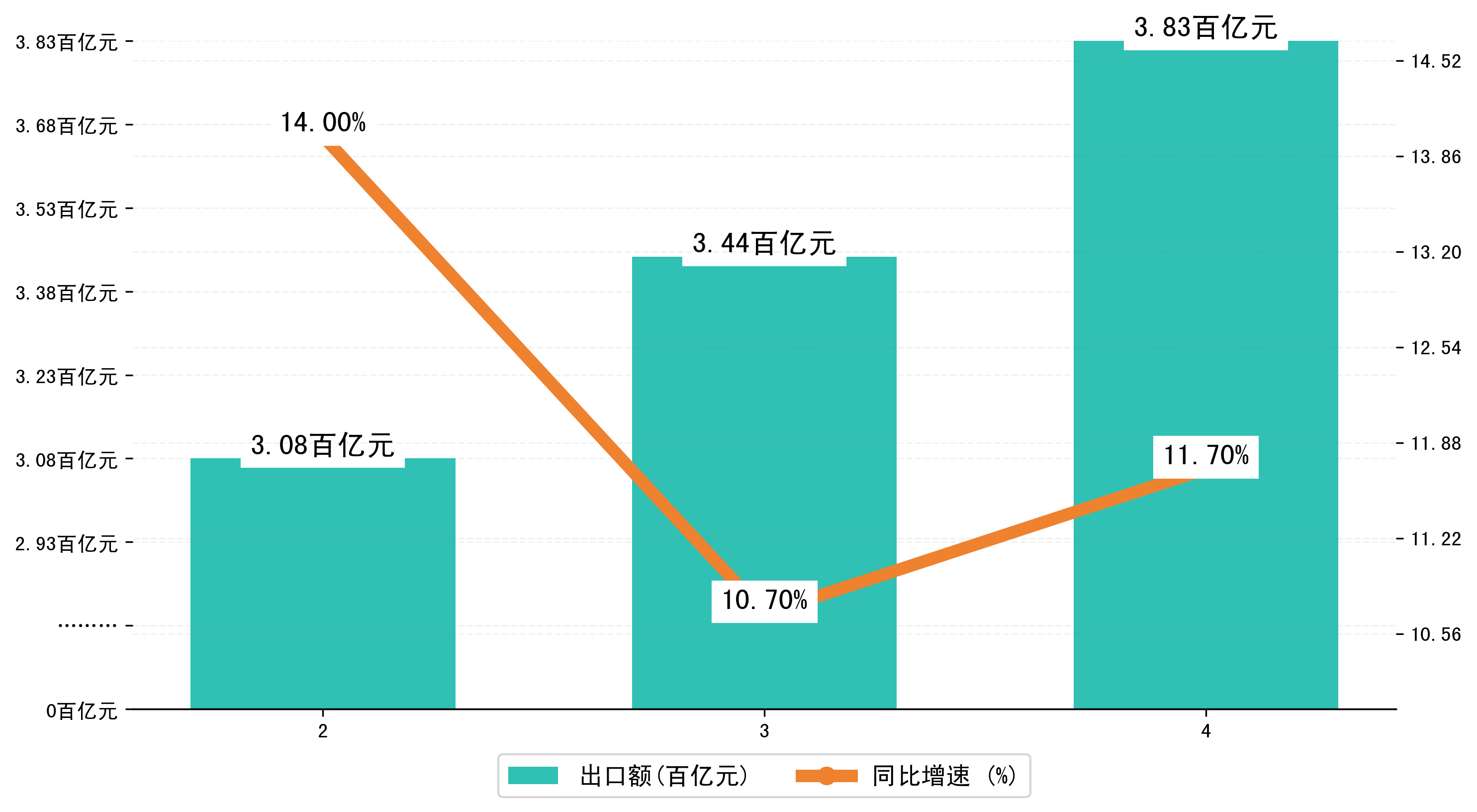 以人民币计,2024年1-4月湖北省出口额为1431,3494.2977万元,相比上年同期增加了129,7666.8584万元,同比增加了11.70%。