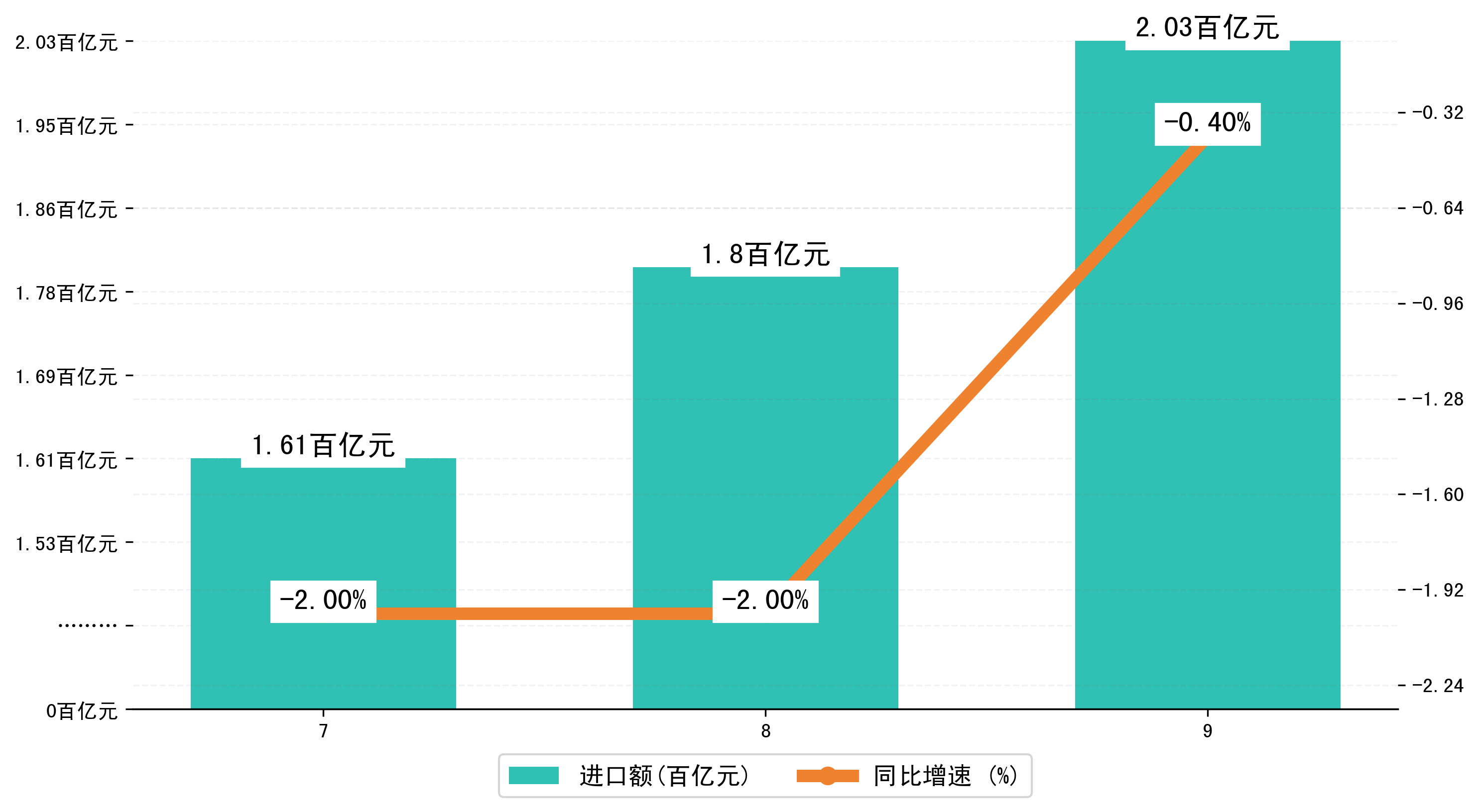 以人民币计,2023年9月湖北省进口额为203,1936.2559万元,相比上月增加了22,9212.8556万元;相比上年同期增加了20,7290.5769万元,同比减少了-0.40%。