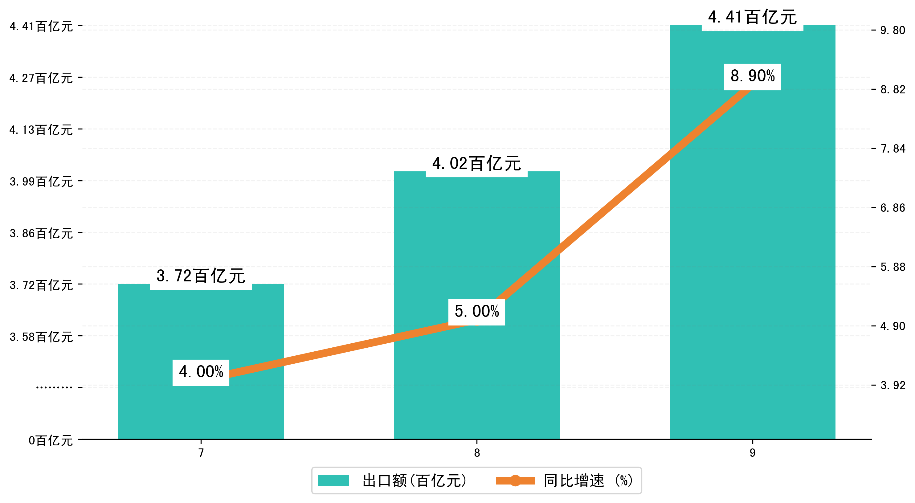 以人民币计,2024年9月湖北省出口额为440,6073.2352万元,相比上月增加了38,8971.7723万元;相比上年同期增加了131,8707.0532万元,同比增加了8.90%。