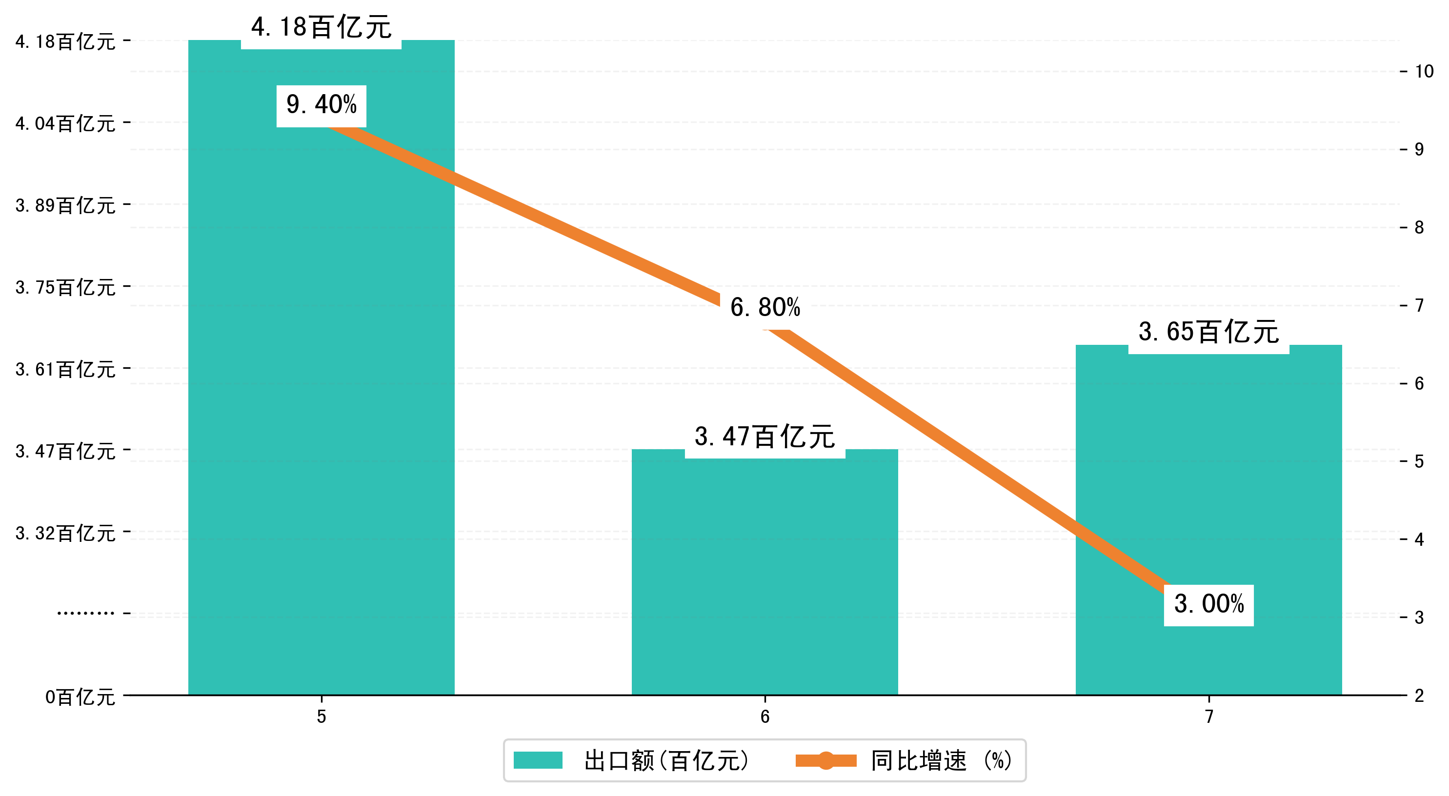 以人民币计,2023年7月湖北省出口额为364,9501.6945万元,相比上月增加了18,2144.4045万元;相比上年同期减少了58,9718.3312万元,同比增加了3.00%。