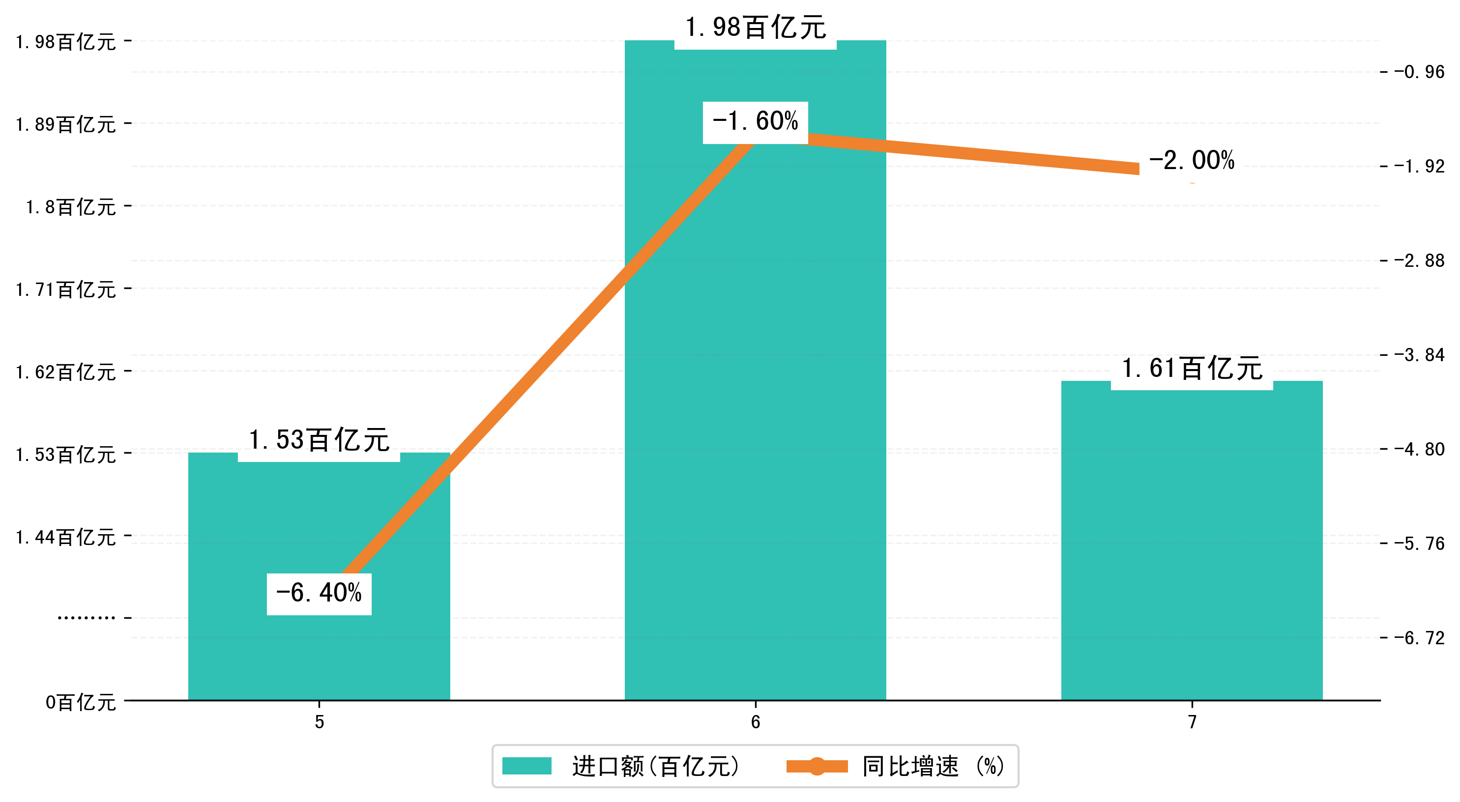 以人民币计,2023年7月湖北省进口额为160,9637.466万元,相比上月减少了36,9695.3416万元;相比上年同期减少了9,1007.4442万元,同比减少了-2.00%。