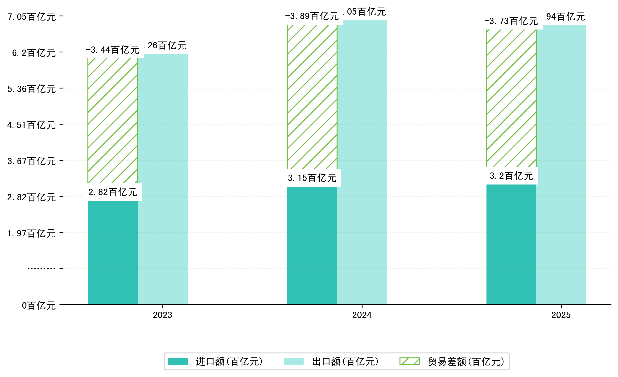 以人民币计,2025年2月湖北省贸易差额为173,2988,4681万元(贸易顺差),相比上月减少了26,7873,4645万元,即3,7085,5166万美元;相比上年同期减少了2,4748,2567万元,同比减少-1.41%。