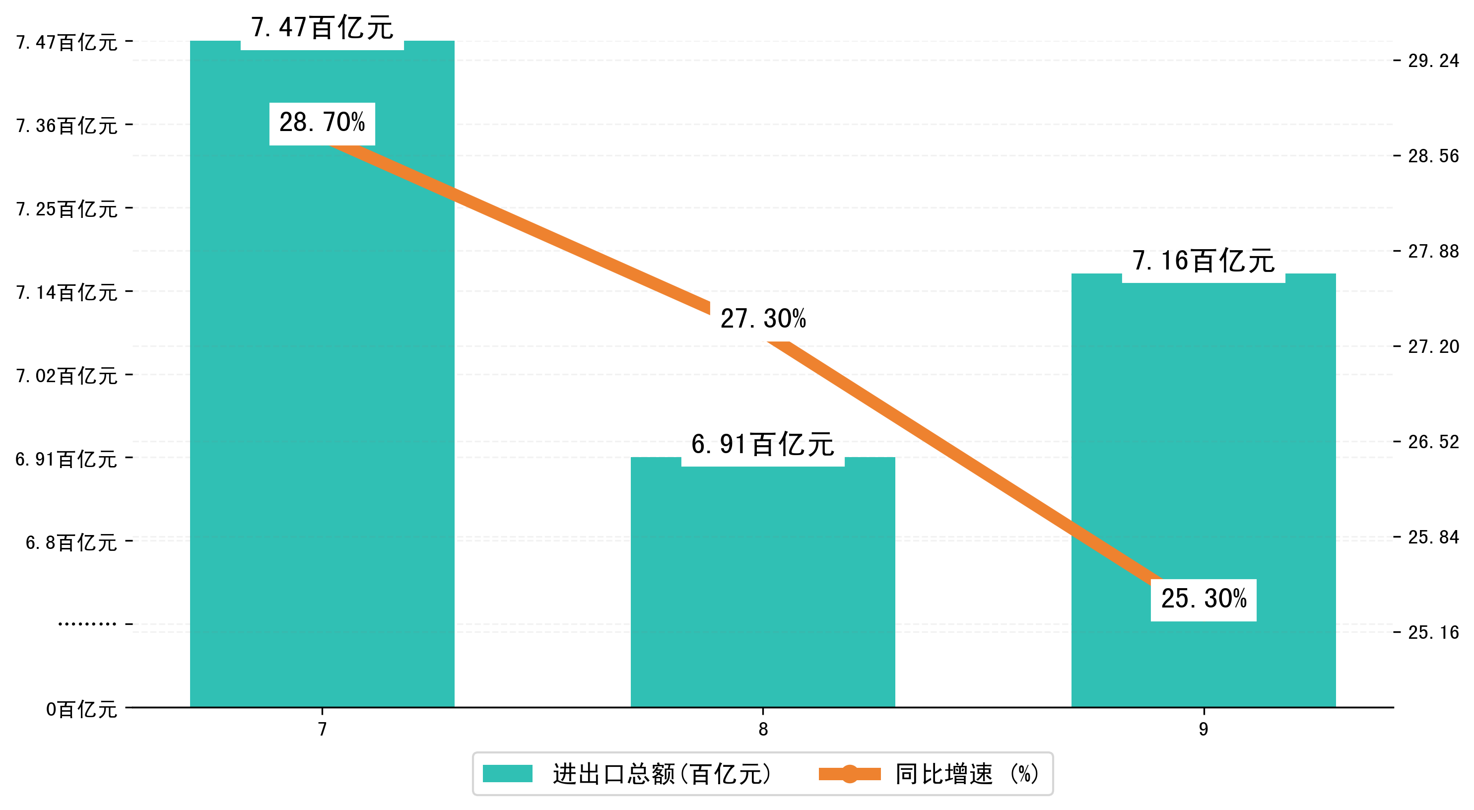 以人民币计,2025年9月湖北省进出口总额为715,9362.8316万元,相比上月增加了24,7778.7915万元;相比上年同期增加了76,1052.9867万元,同比增加了25.30%。